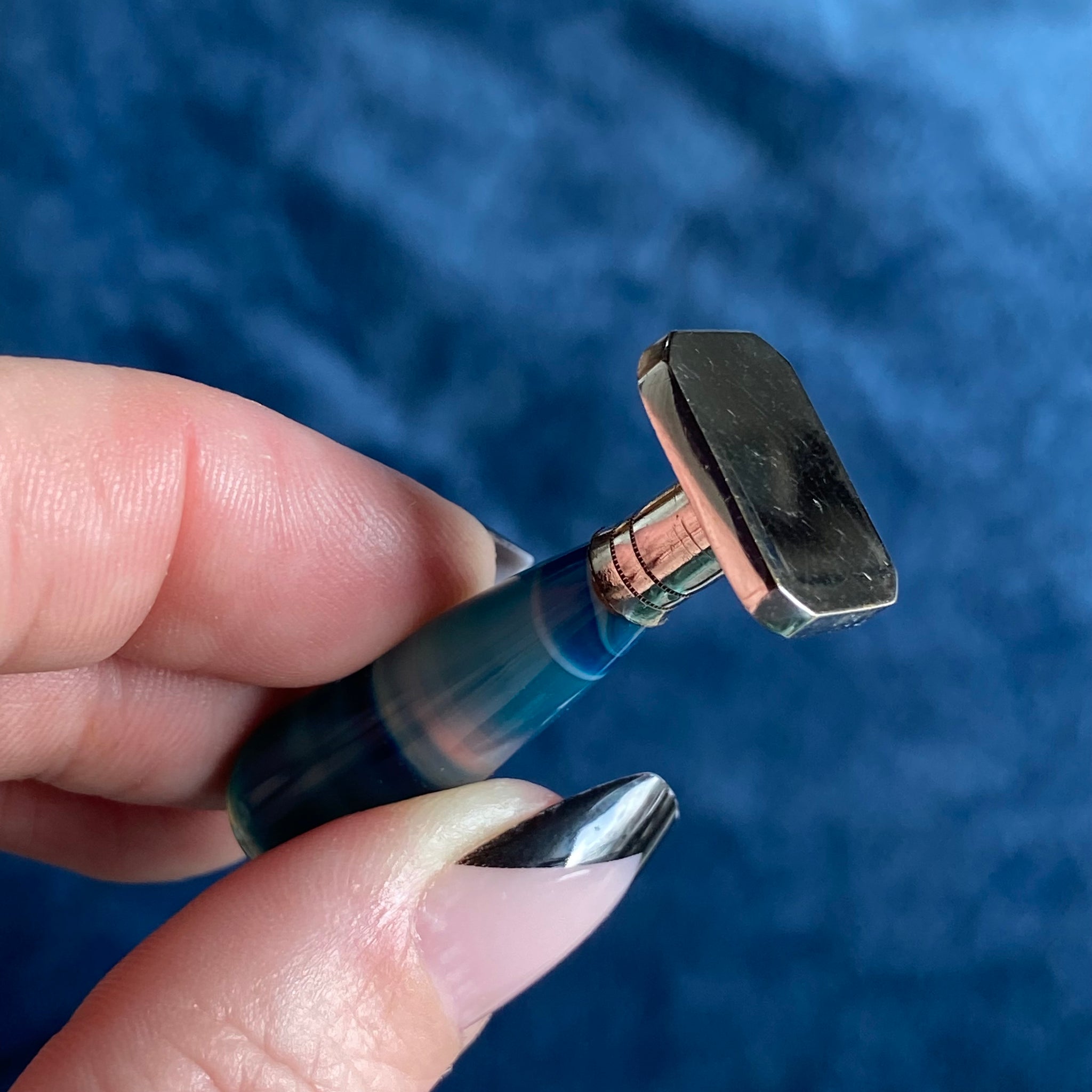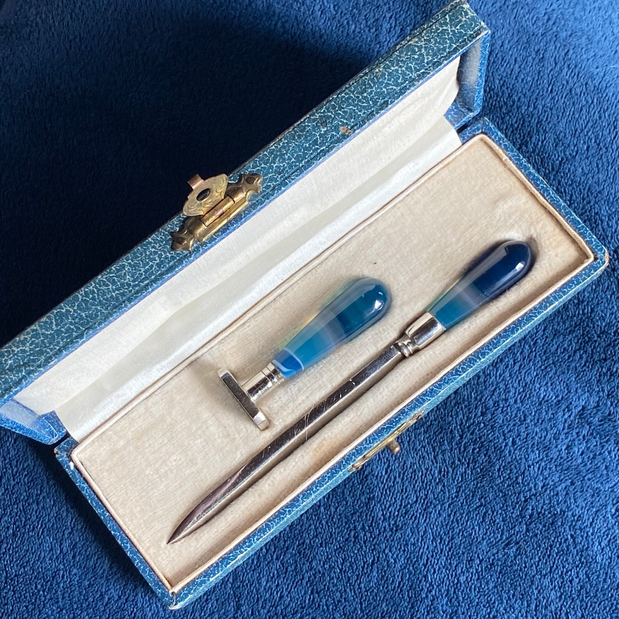 Sweet antique letter opener and stamp set.  With dyed blue agate handles and original box.