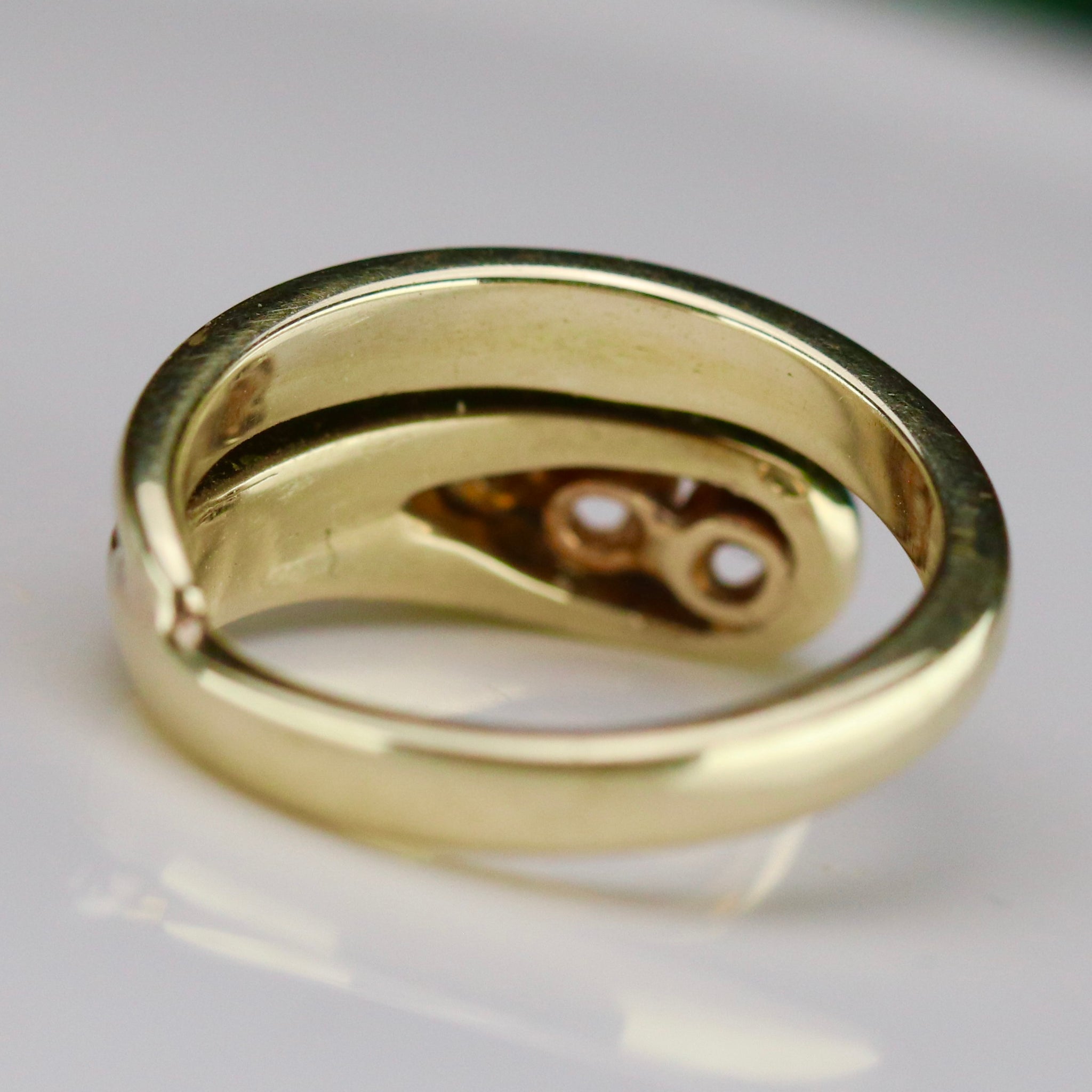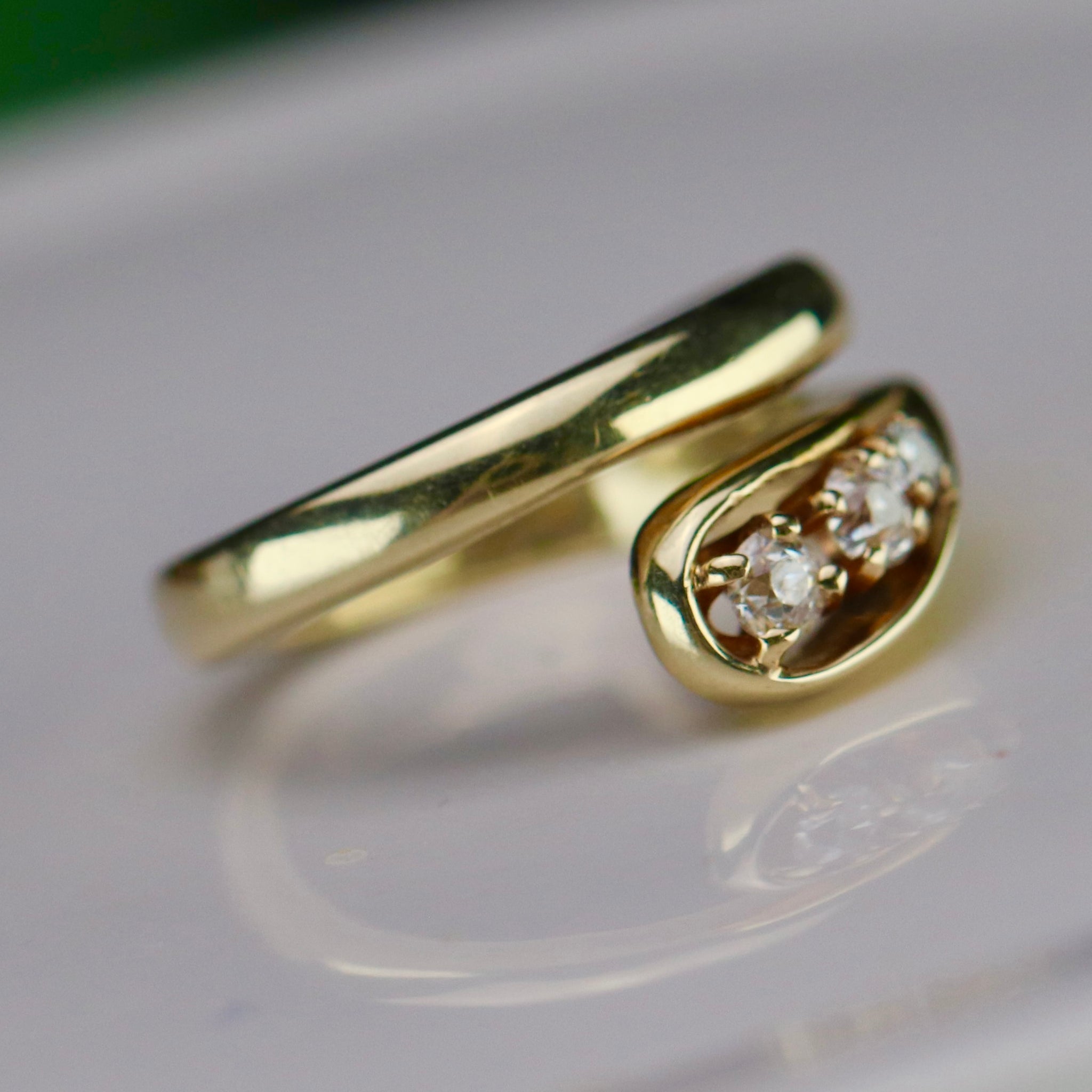 Pretty diamond ring in 14k yellow gold. Modern snake style design with approx .15ctw of old cut diamonds. Smallest diamond has a small chip that isn’t easily seen to the naked eye. In good vintage condition. Small size which would make it a perfect pinky ring.