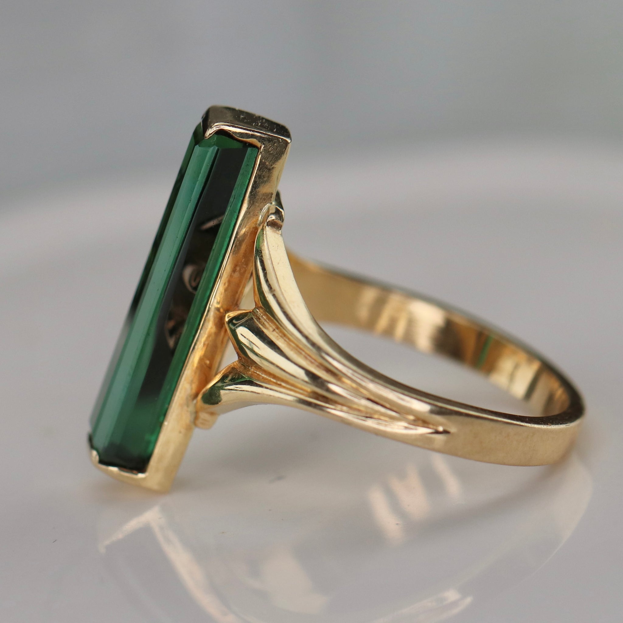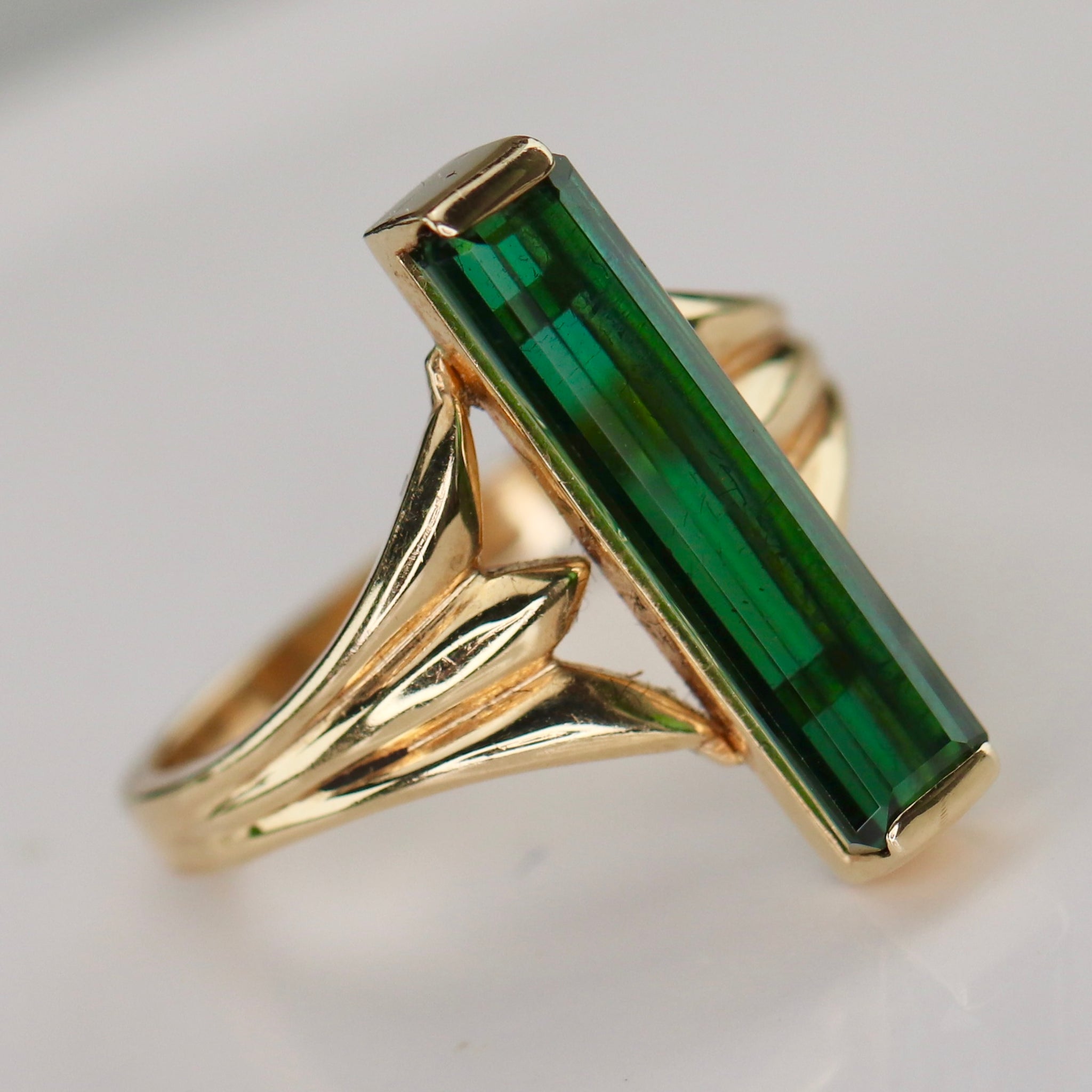 What a ring! Simple but stunning long and lean green tourmaline ring in 14k yellow gold. Estate piece, beautifully made. Tourmaline is deep green with natural inclusions. Set with wide shoulders. Likely a one of a kind piece. In very good condition.