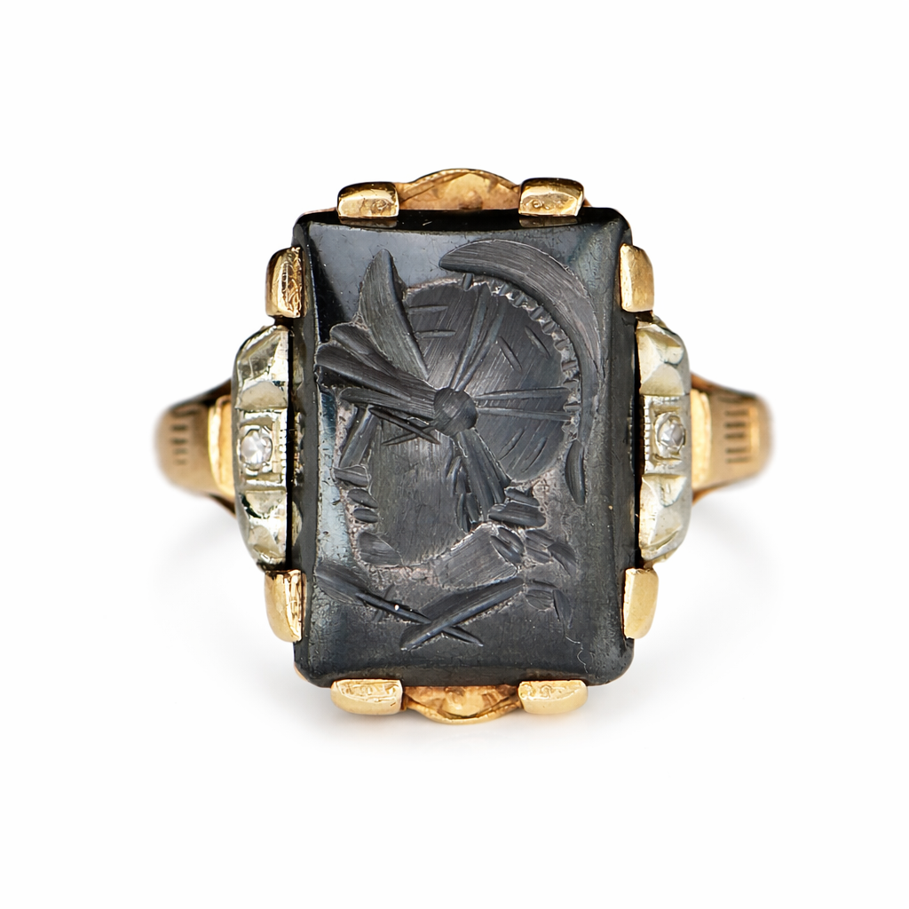 Gorgeous vintage hematite intaglio ring in 10k yellow gold with diamond accents. Said to have protective qualities, hematite is a favorite here at The Manor! Carved with a Roman centurion. In good condition - sone thinning to the shank. Circa 1950.