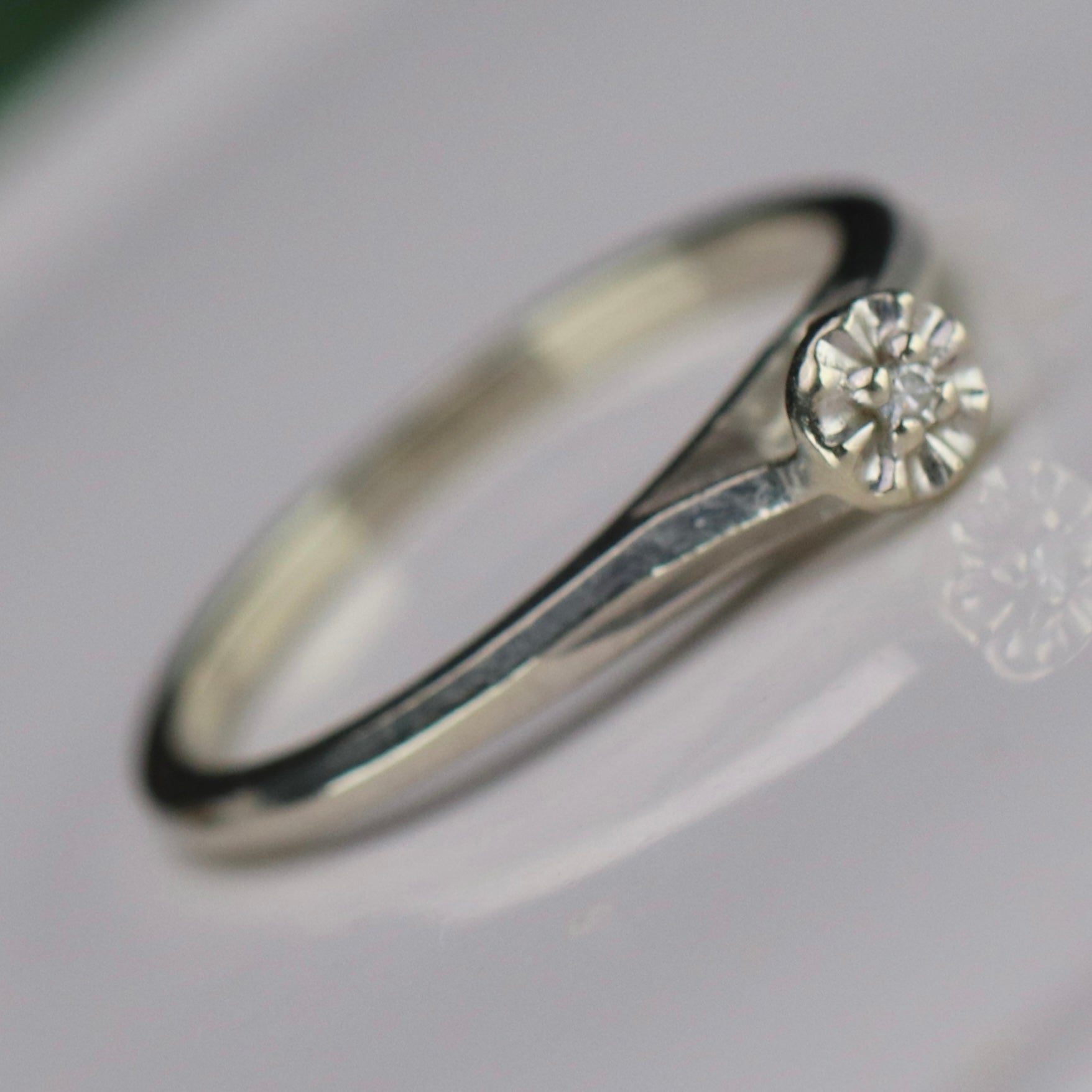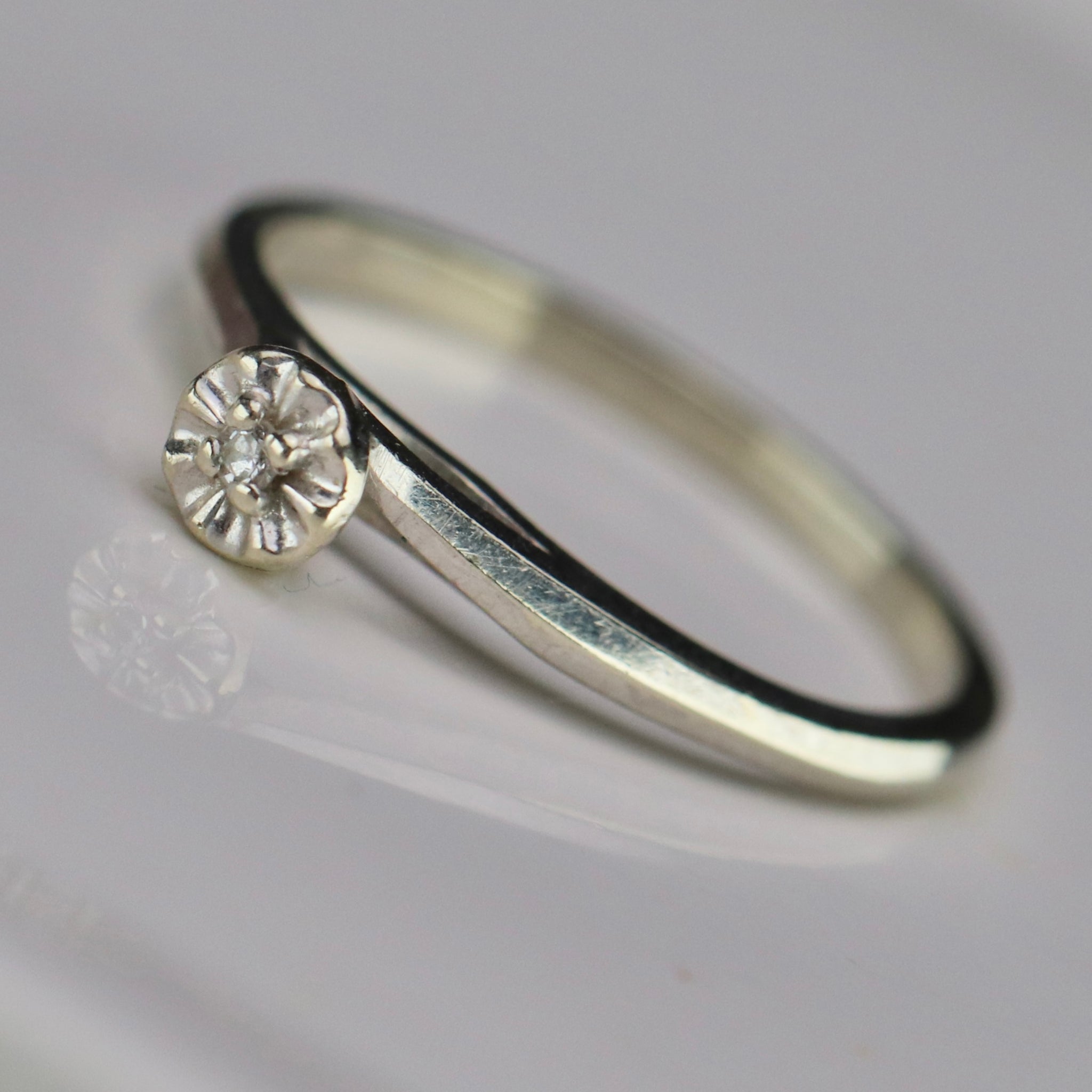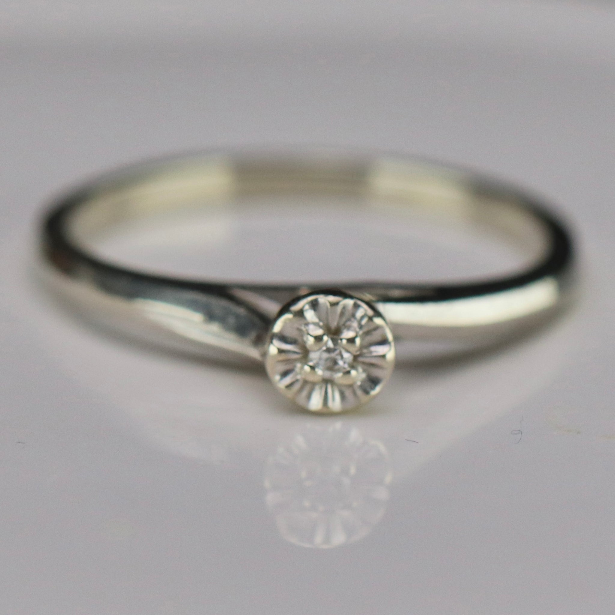 Vintage diamond solitaire in 14k white gold. Sweet, simple, dainty design with a single small diamond. In very good condition.