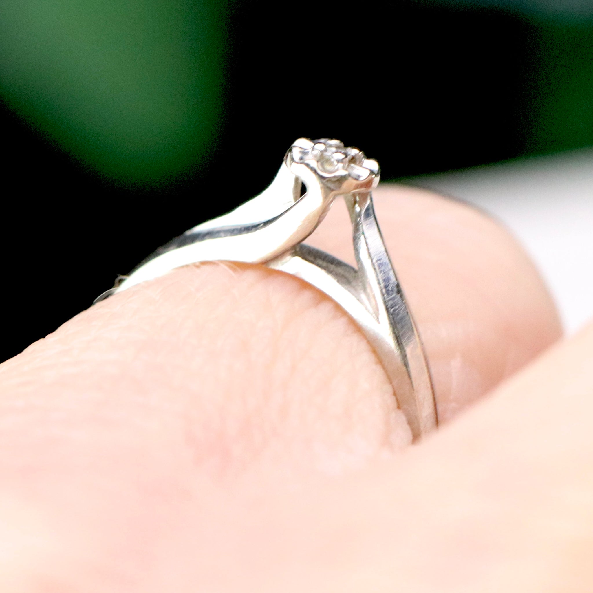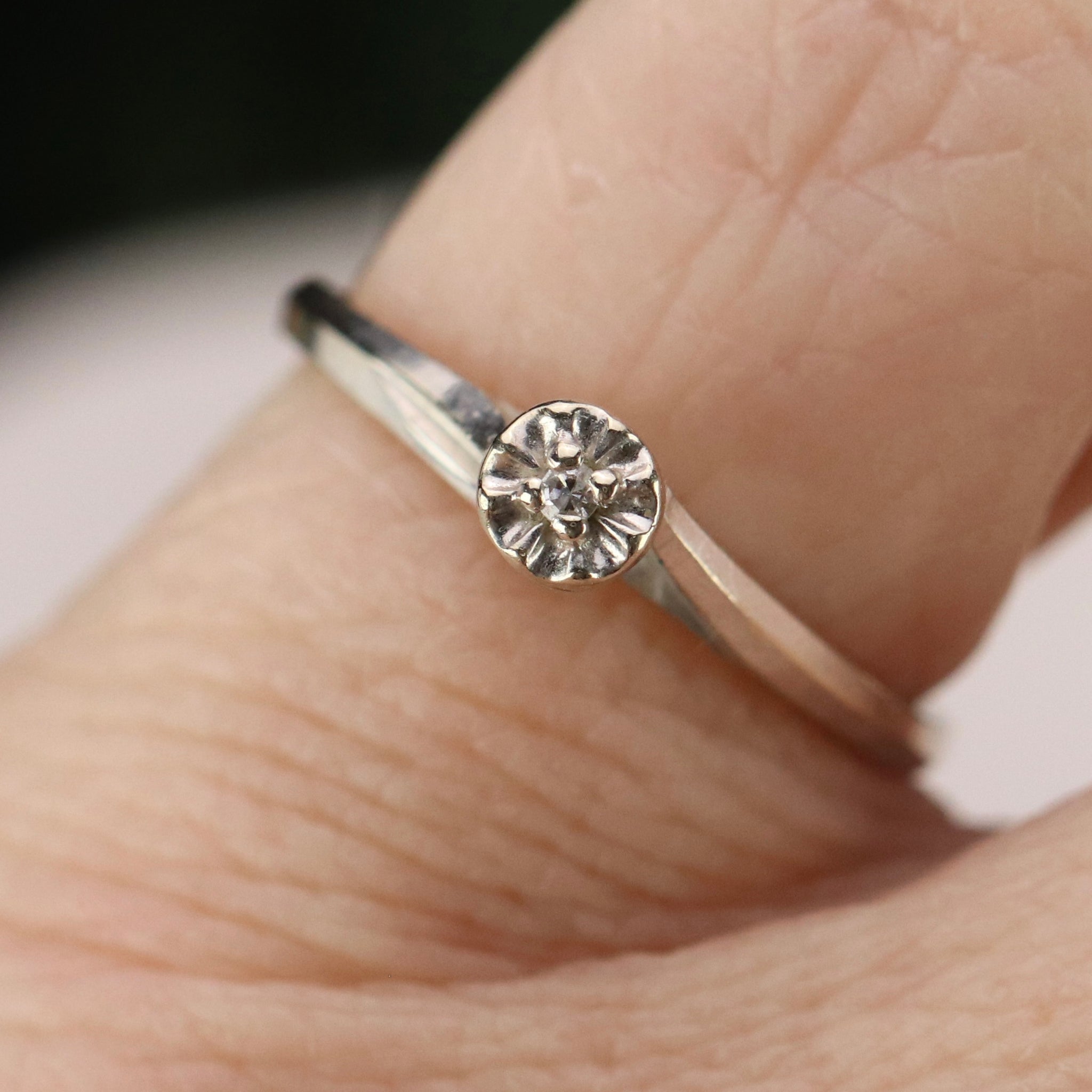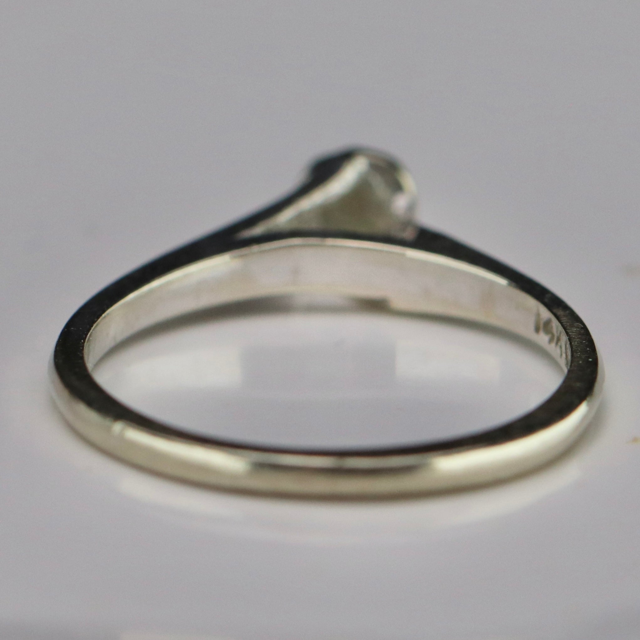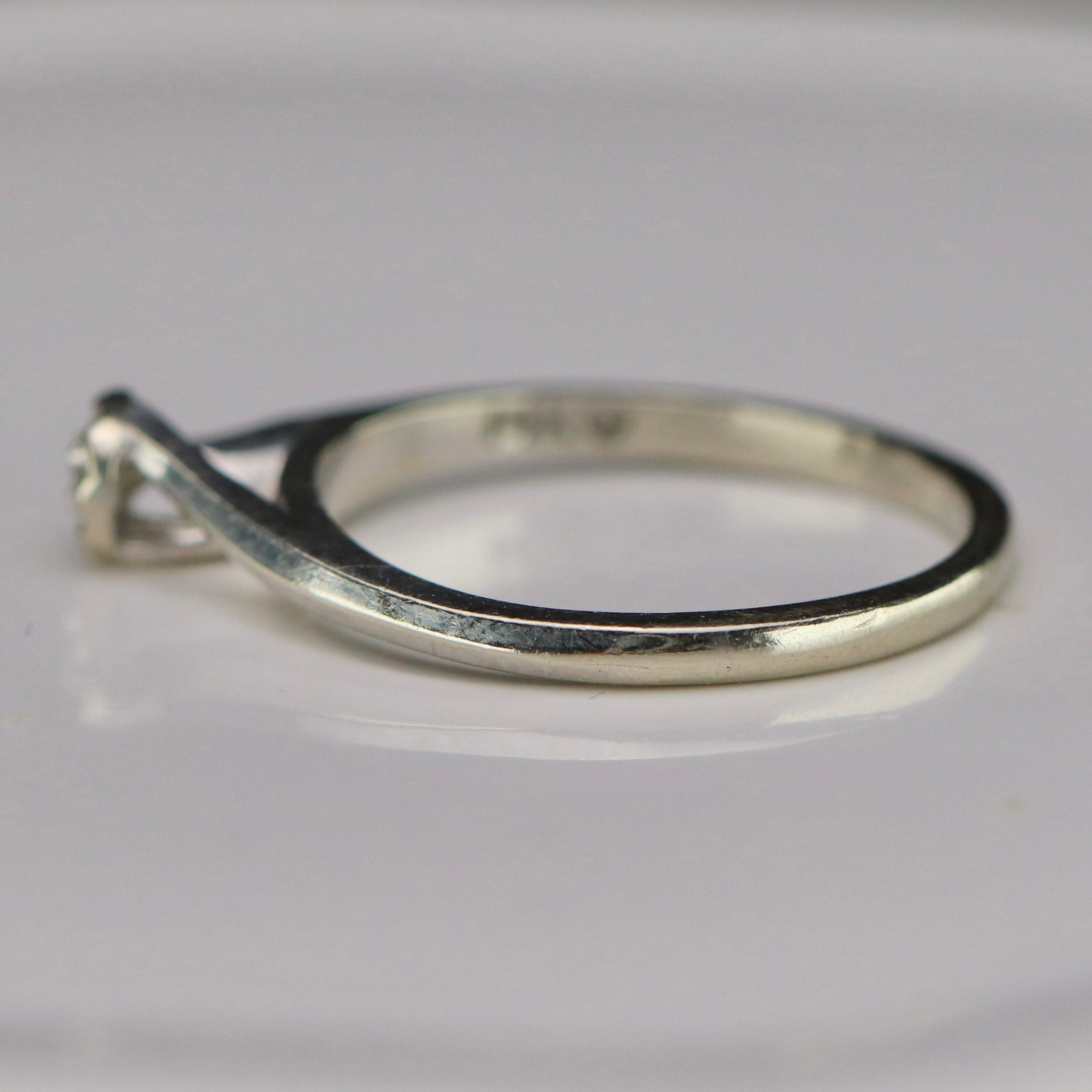 Vintage diamond solitaire in 14k white gold. Sweet, simple, dainty design with a single small diamond. In very good condition.