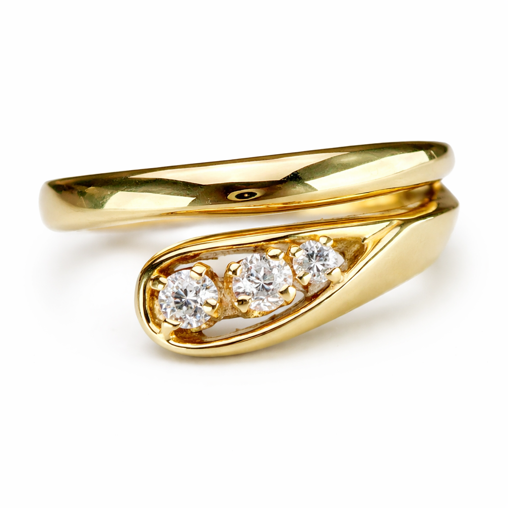 Pretty diamond ring in 14k yellow gold. Modern snake style design with approx .15ctw of old cut diamonds. Smallest diamond has a small chip that isn’t easily seen to the naked eye. In good vintage condition. Small size which would make it a perfect pinky ring.