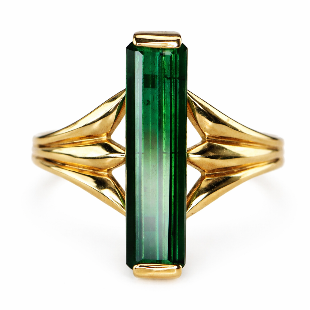 What a ring! Simple but stunning long and lean green tourmaline ring in 14k yellow gold. Estate piece, beautifully made. Tourmaline is deep green with natural inclusions. Set with wide shoulders. Likely a one of a kind piece. In very good condition.