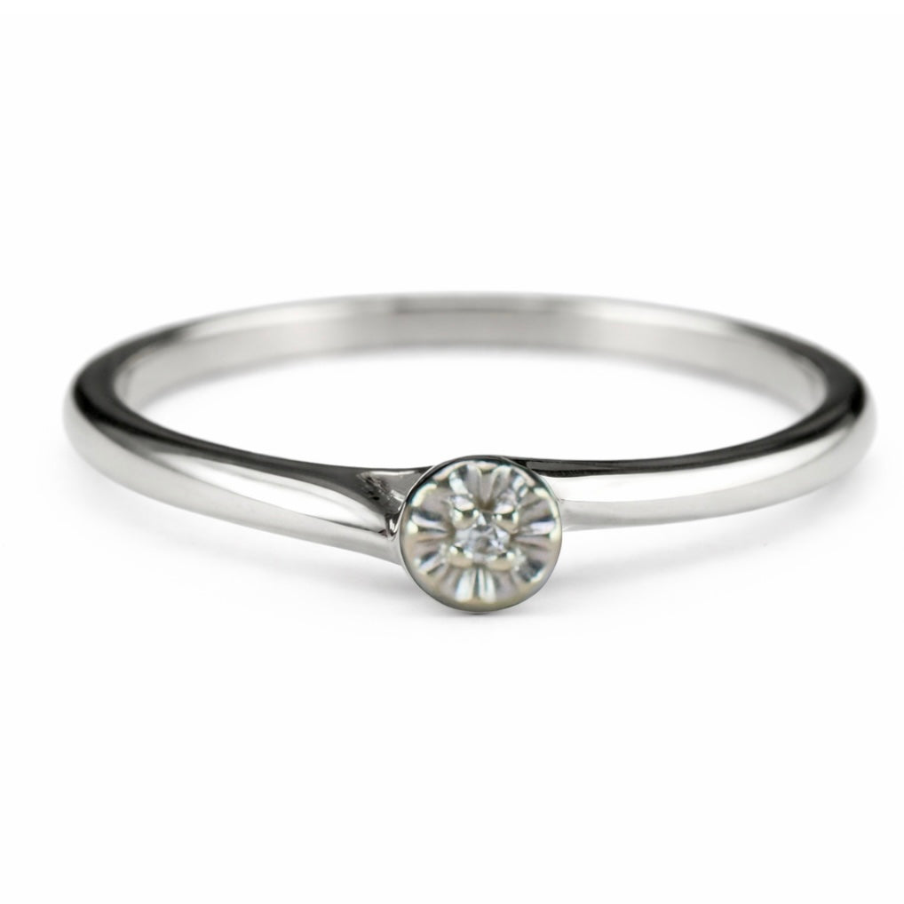 Vintage diamond solitaire in 14k white gold. Sweet, simple, dainty design with a single small diamond. In very good condition.