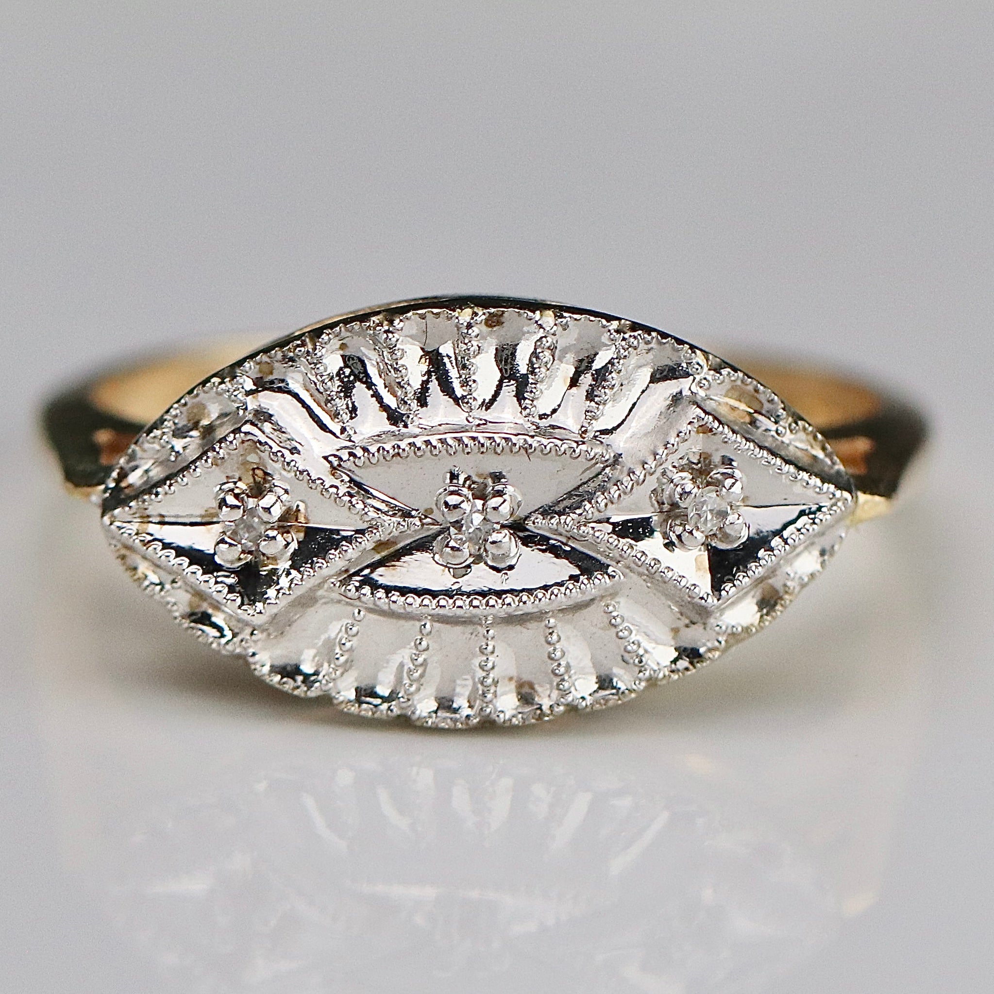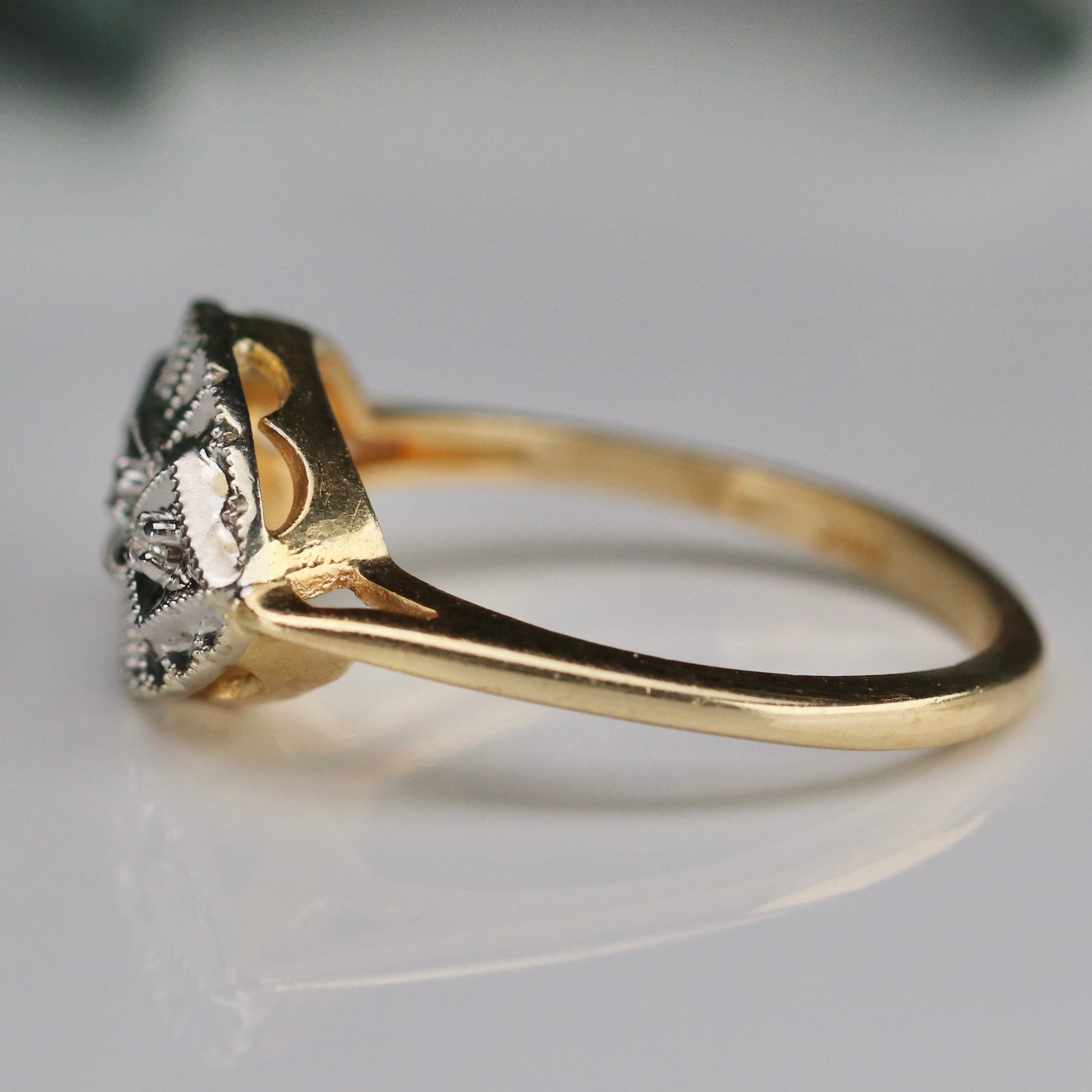 Sweet princess style diamond ring in 10k yellow and white gold. Classic design with 3 diamonds. In excellent condition.