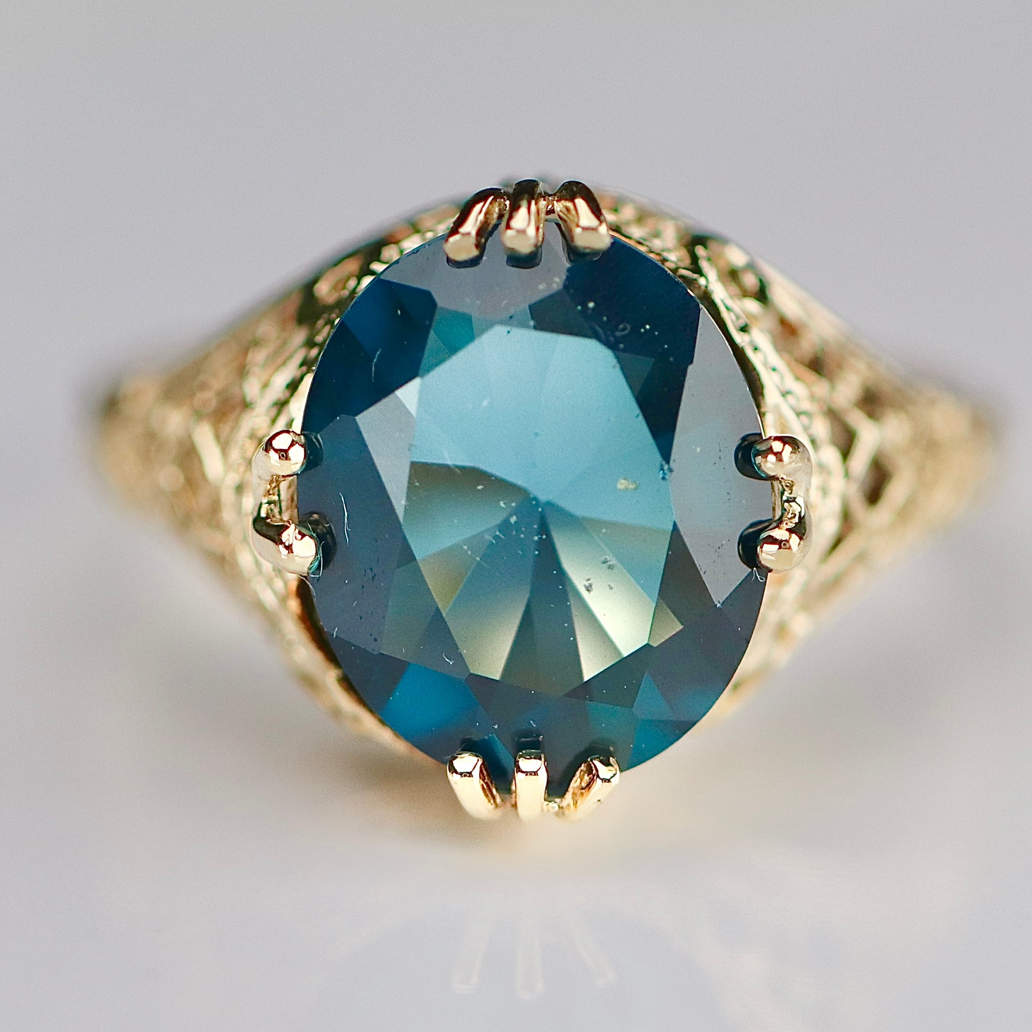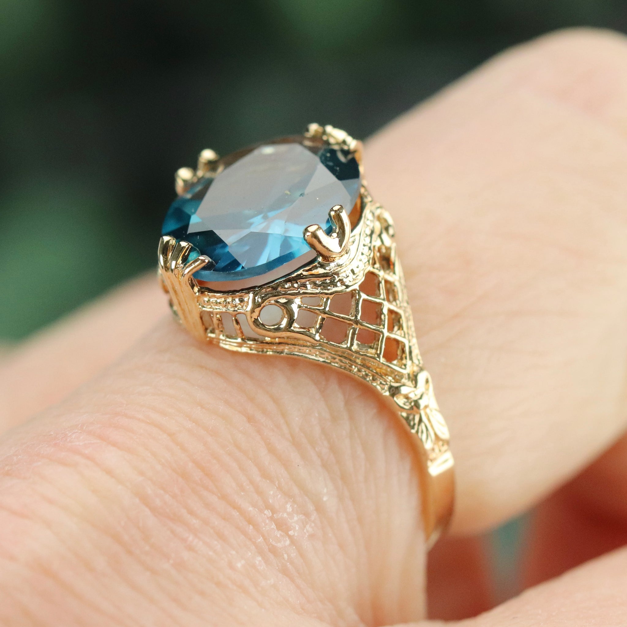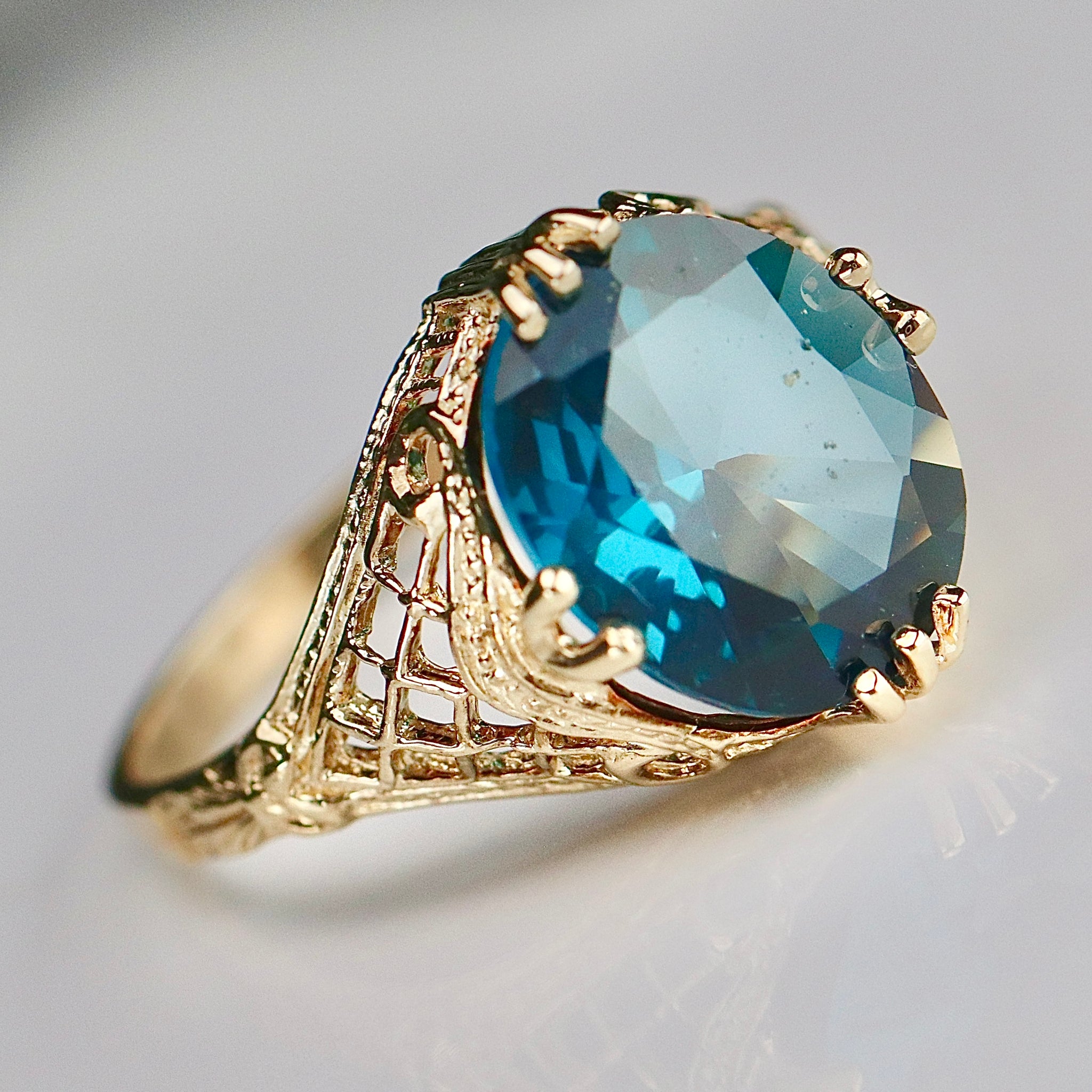 Looks JUST like a London Blue topaz but it’s actually a lab grown spinel! Super pretty clear cushion cut stone in 10k yellow gold. Setting is stunning with filigree throughout. In very good condition. Stone has a fleabite to the table under 10x but nothing noticeable when worn to the naked eye.