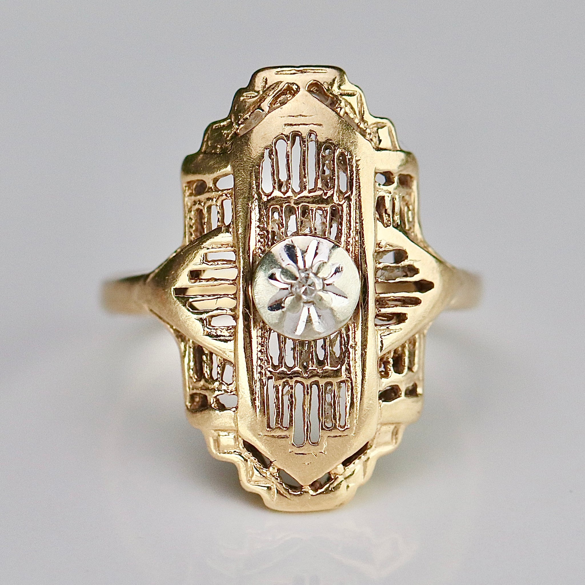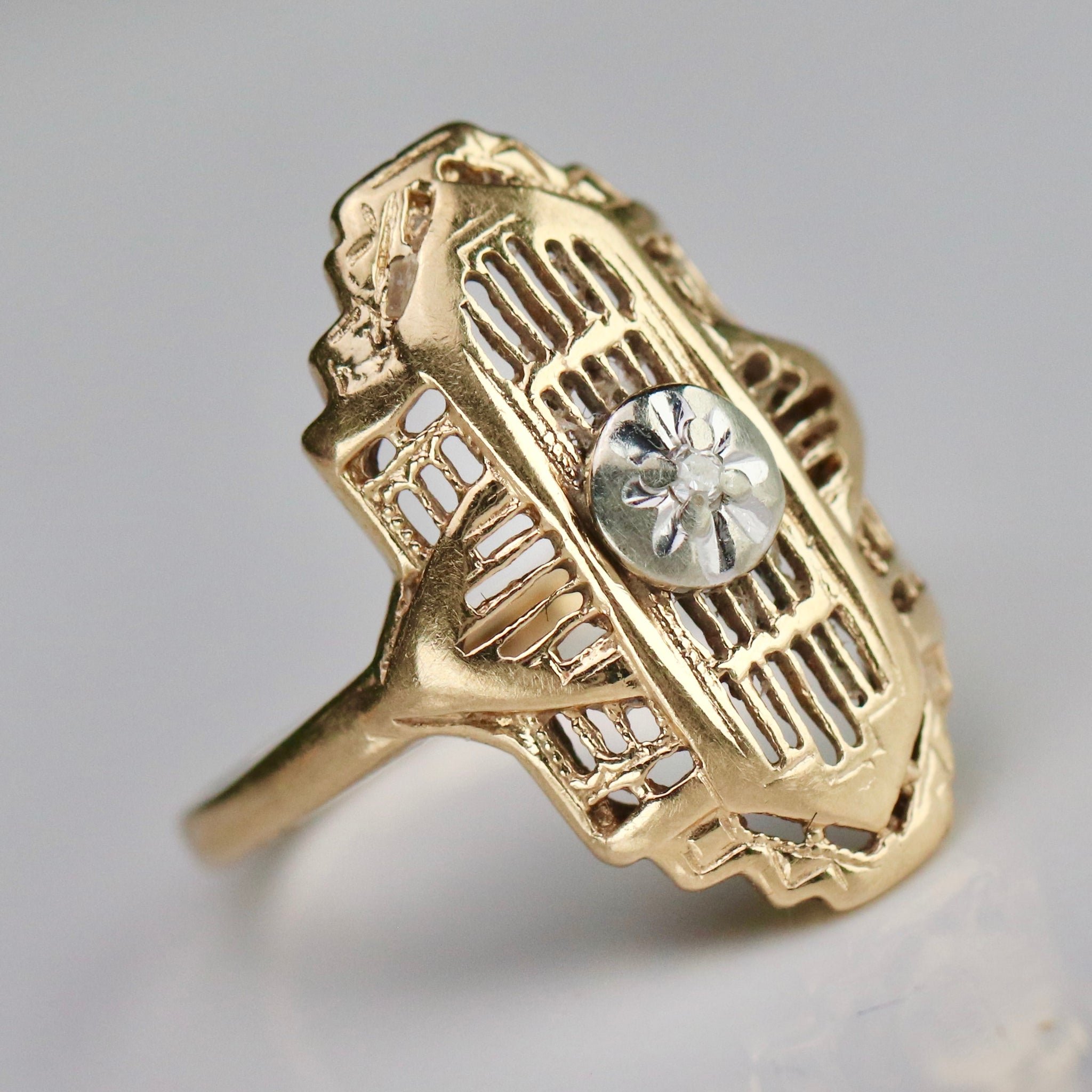Vintage diamond plaque ring in 10k yellow gold. Very pretty piece with lots of details. Finding pieces like this is getting really hard to do, especially with rising gold prices. In good condition.