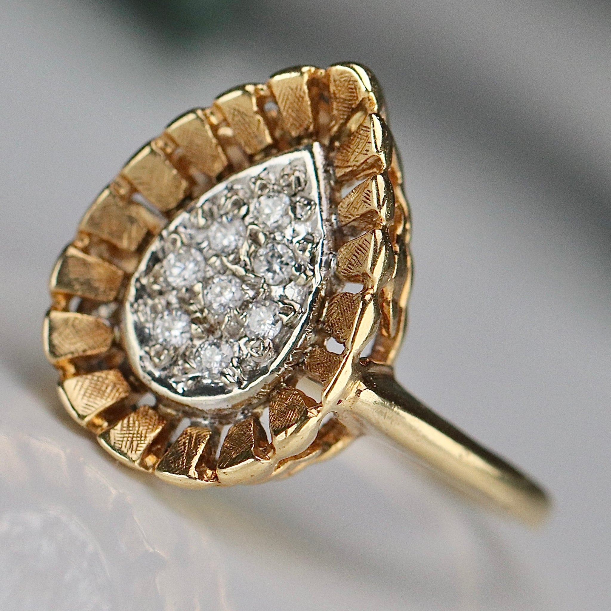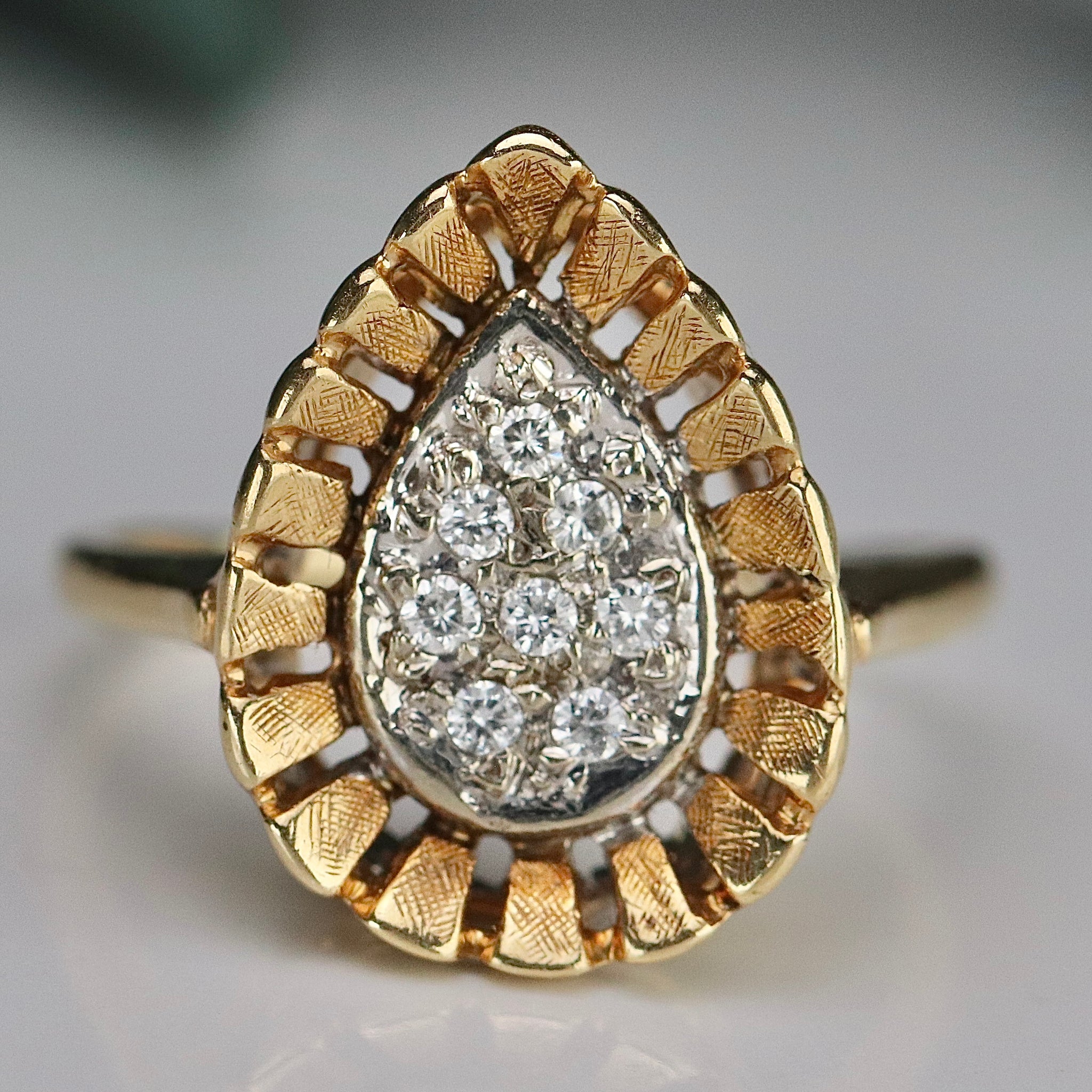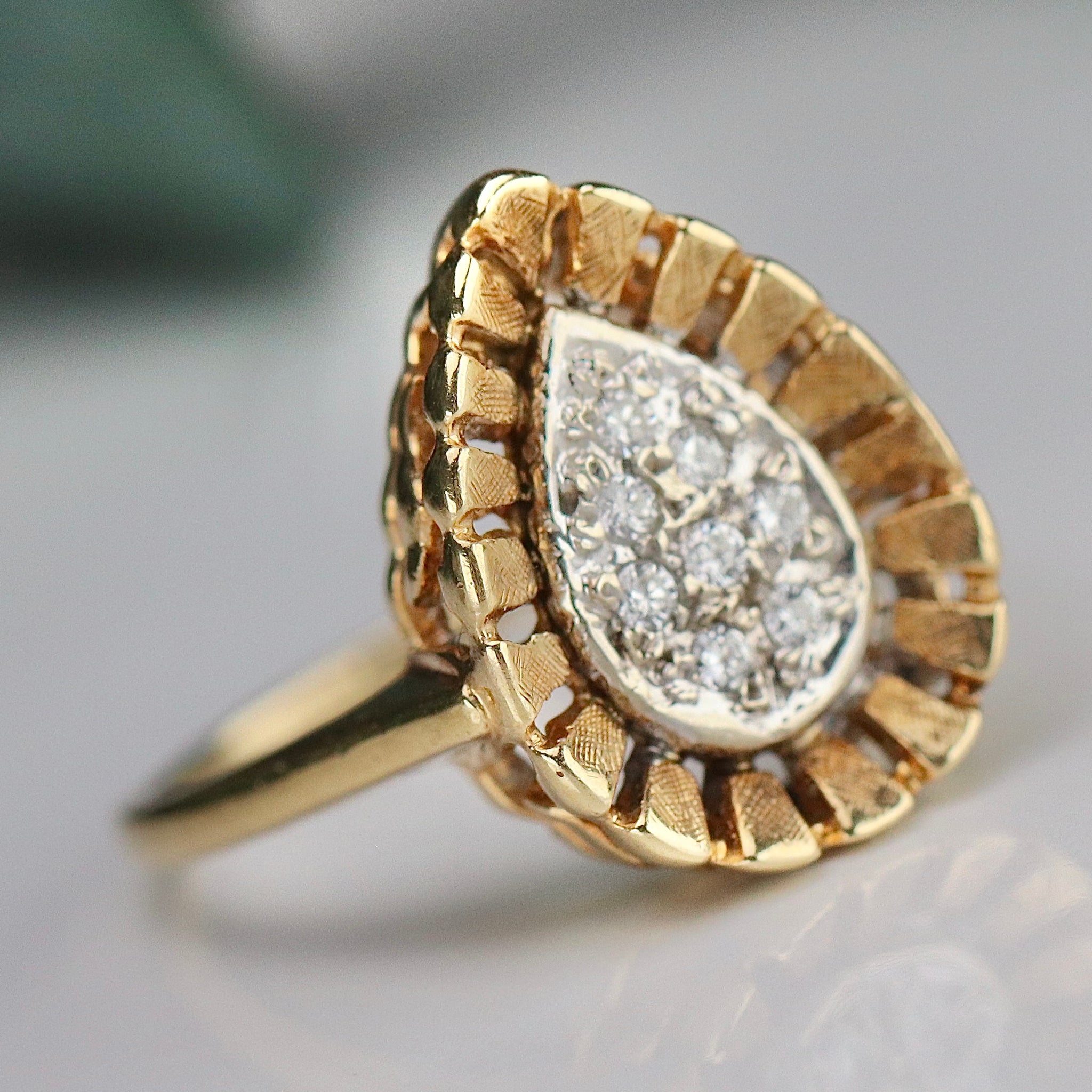 Vintage pear shaped diamond cluster ring in 14k yellow gold. With approx .20ctw of diamonds surround by a fluted gold halo. In very good condition.
