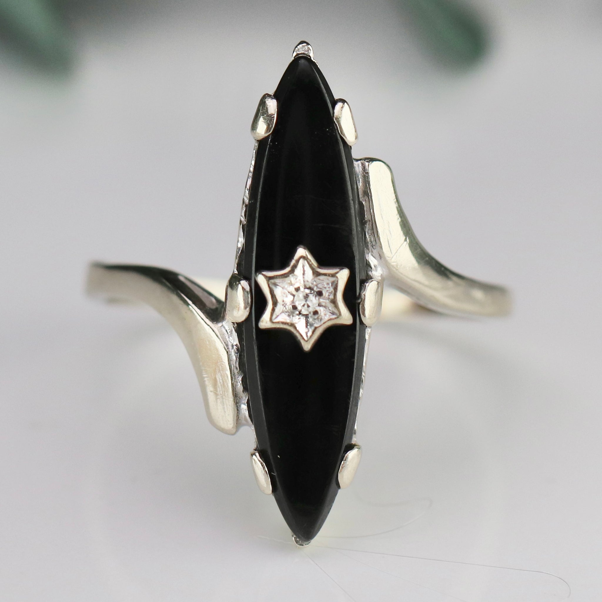 Beautiful navette onyx and diamond ring in 10k white gold.  Pretty piece that's very flattering on the finger.  With a star shape to the center with a small diamond.  Large finger size!  Hard to find!  In good condition.