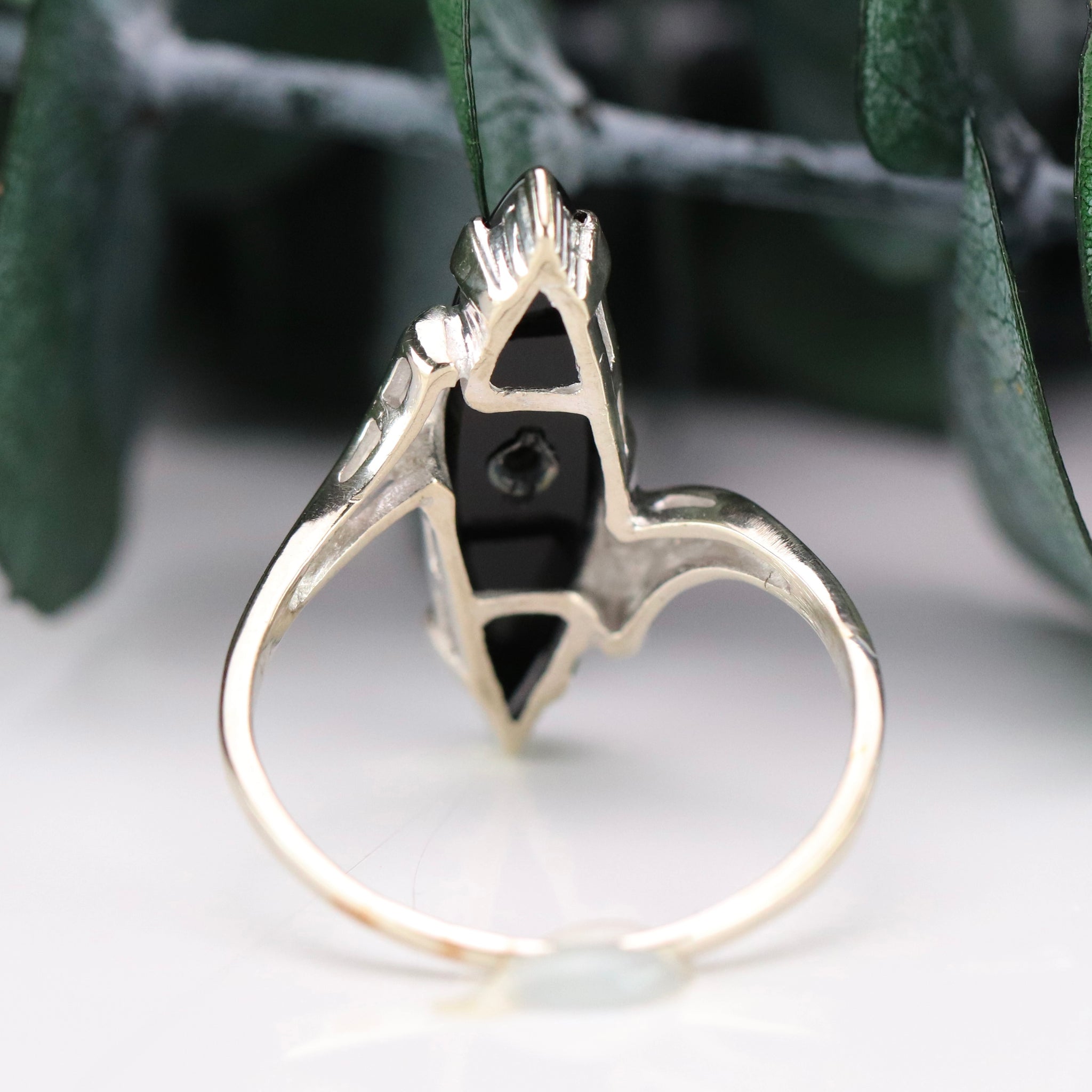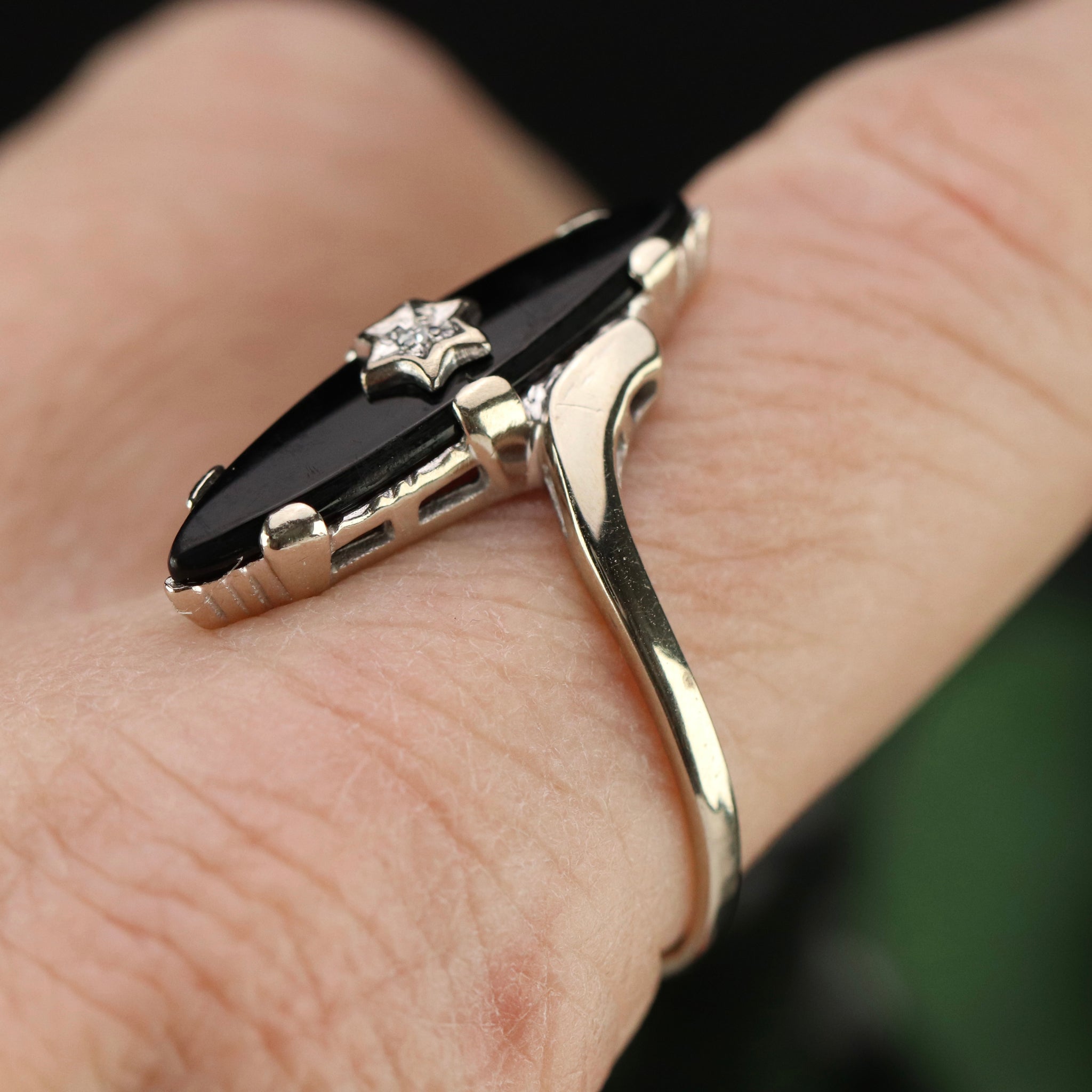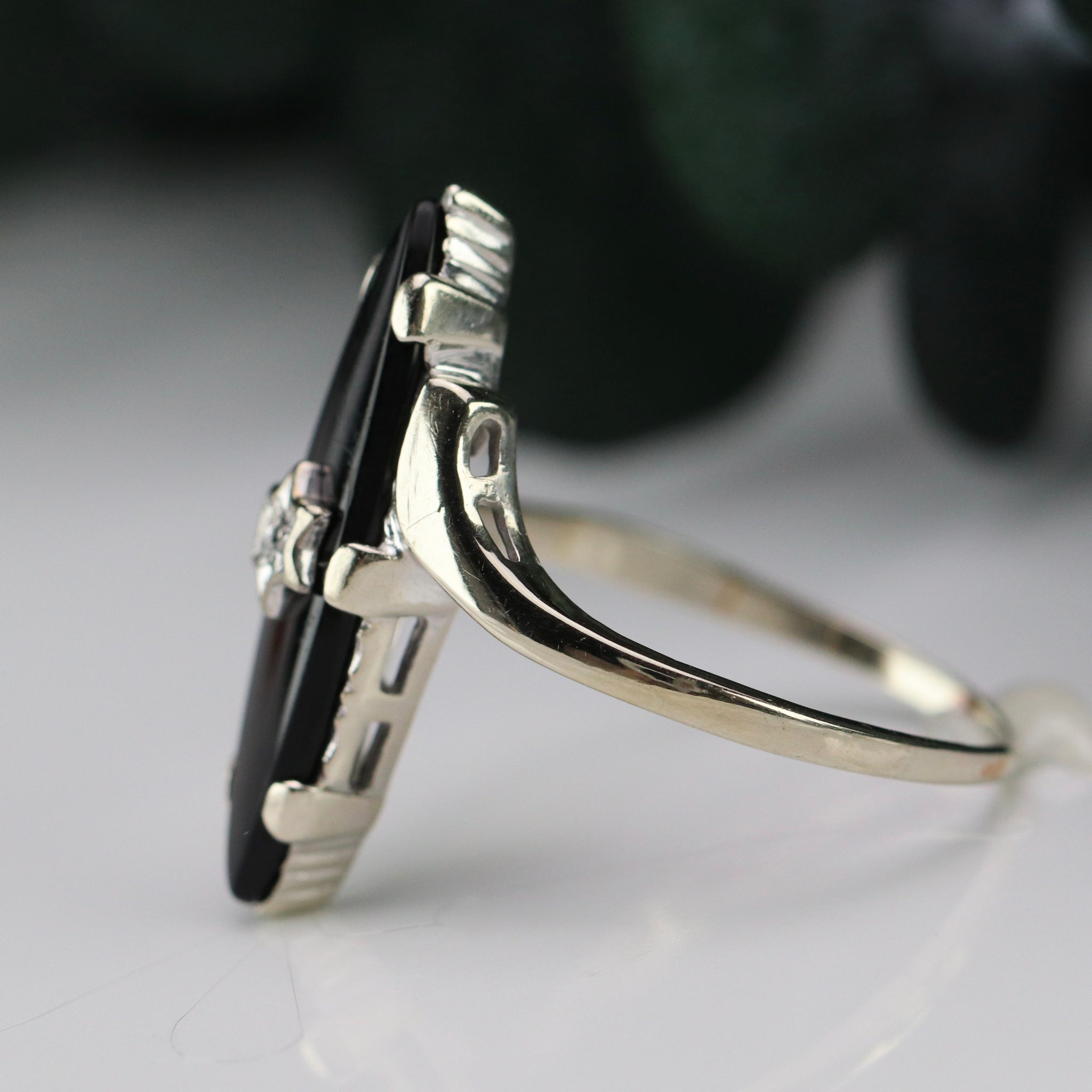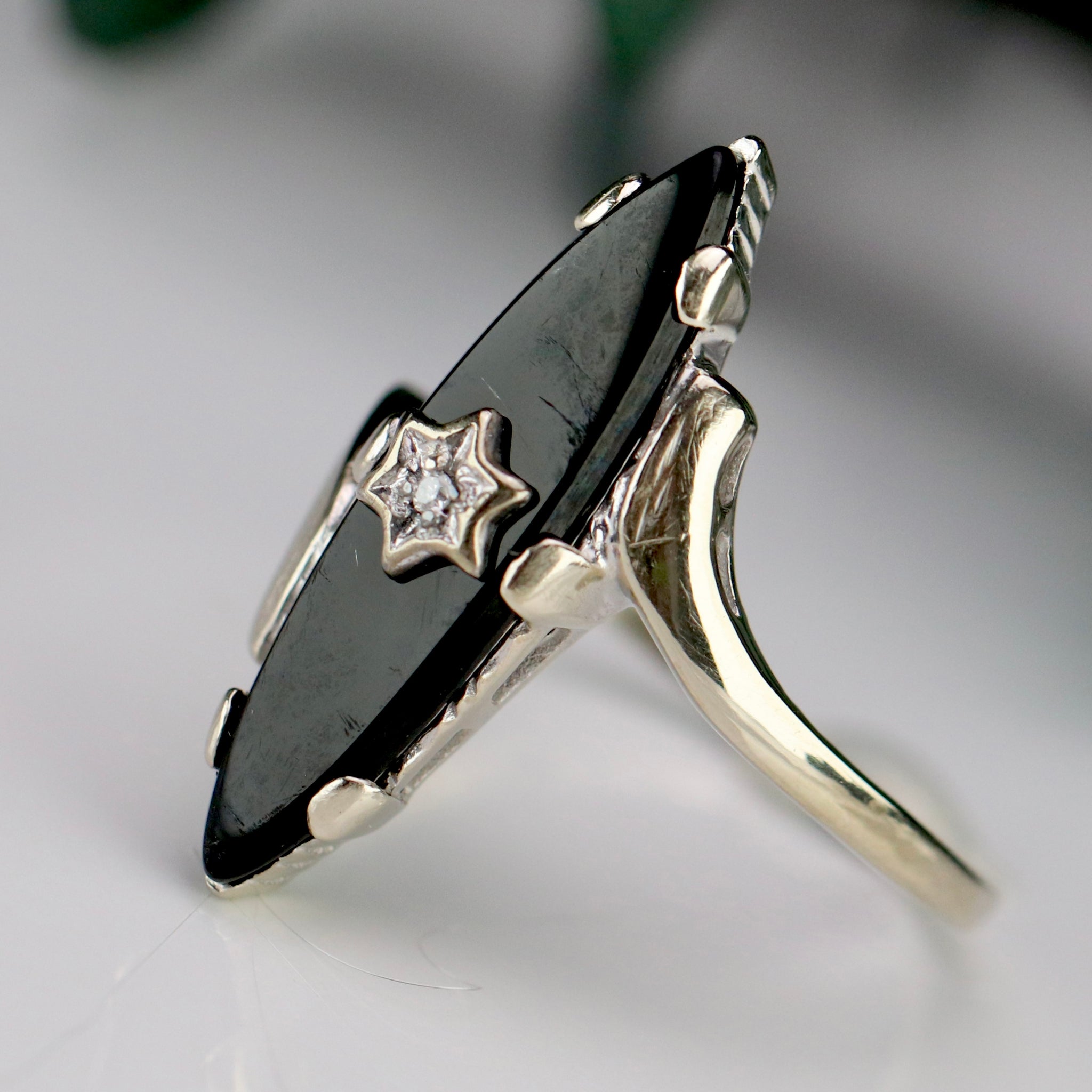 Vintage navette onyx and diamond ring in white gold