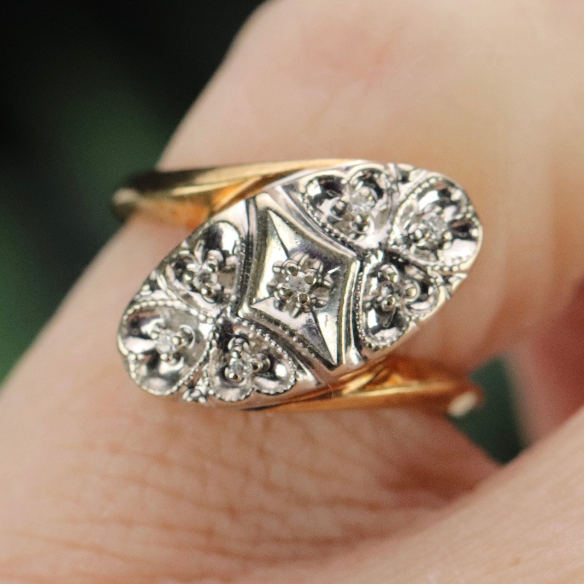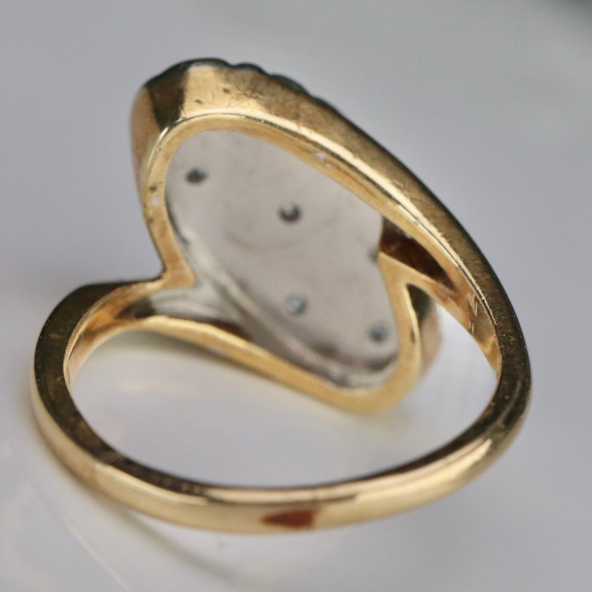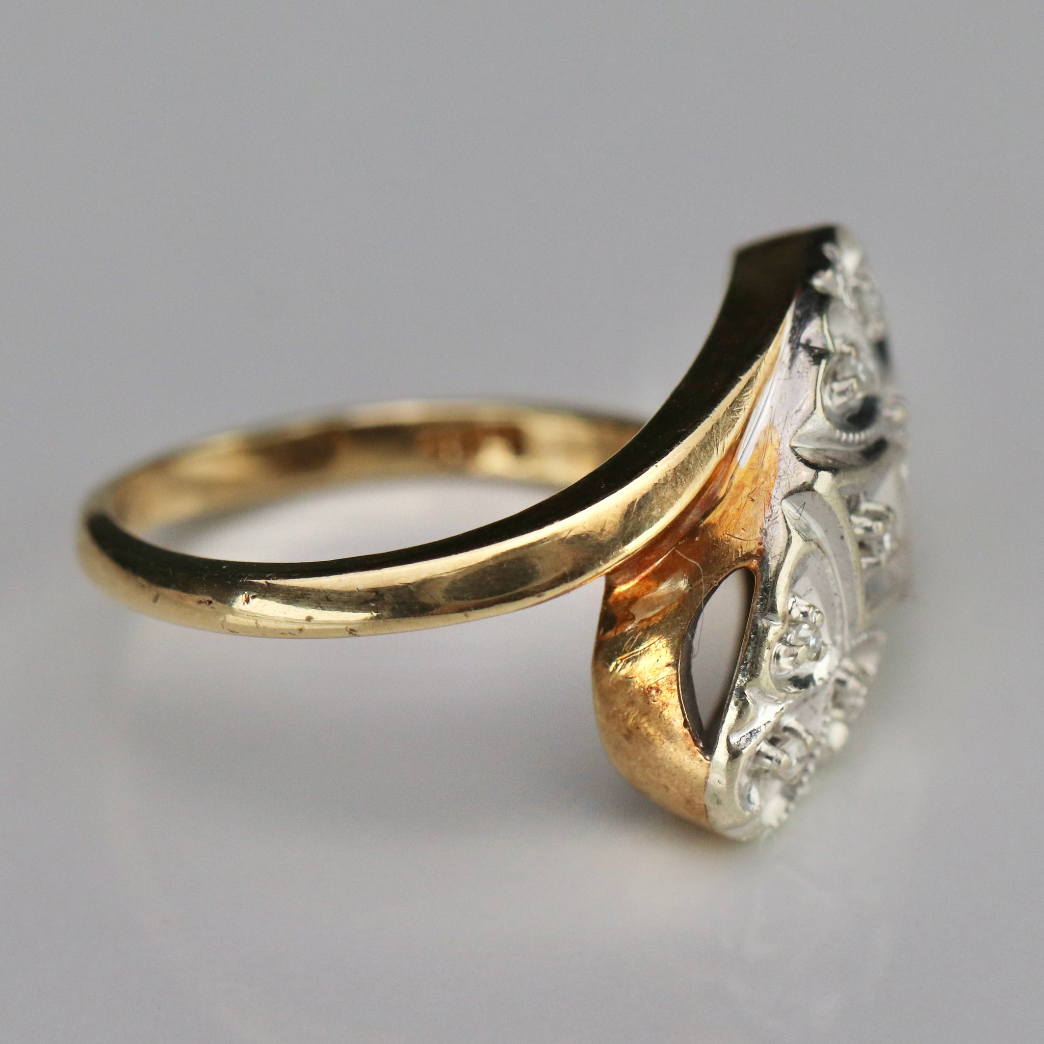 Love this piece! Stunning princess style diamond ring in 14k yellow and white gold. This is an unusual piece in that it’s set on a twist - really visually delightful! Absolutely beautiful piece in very good condition.