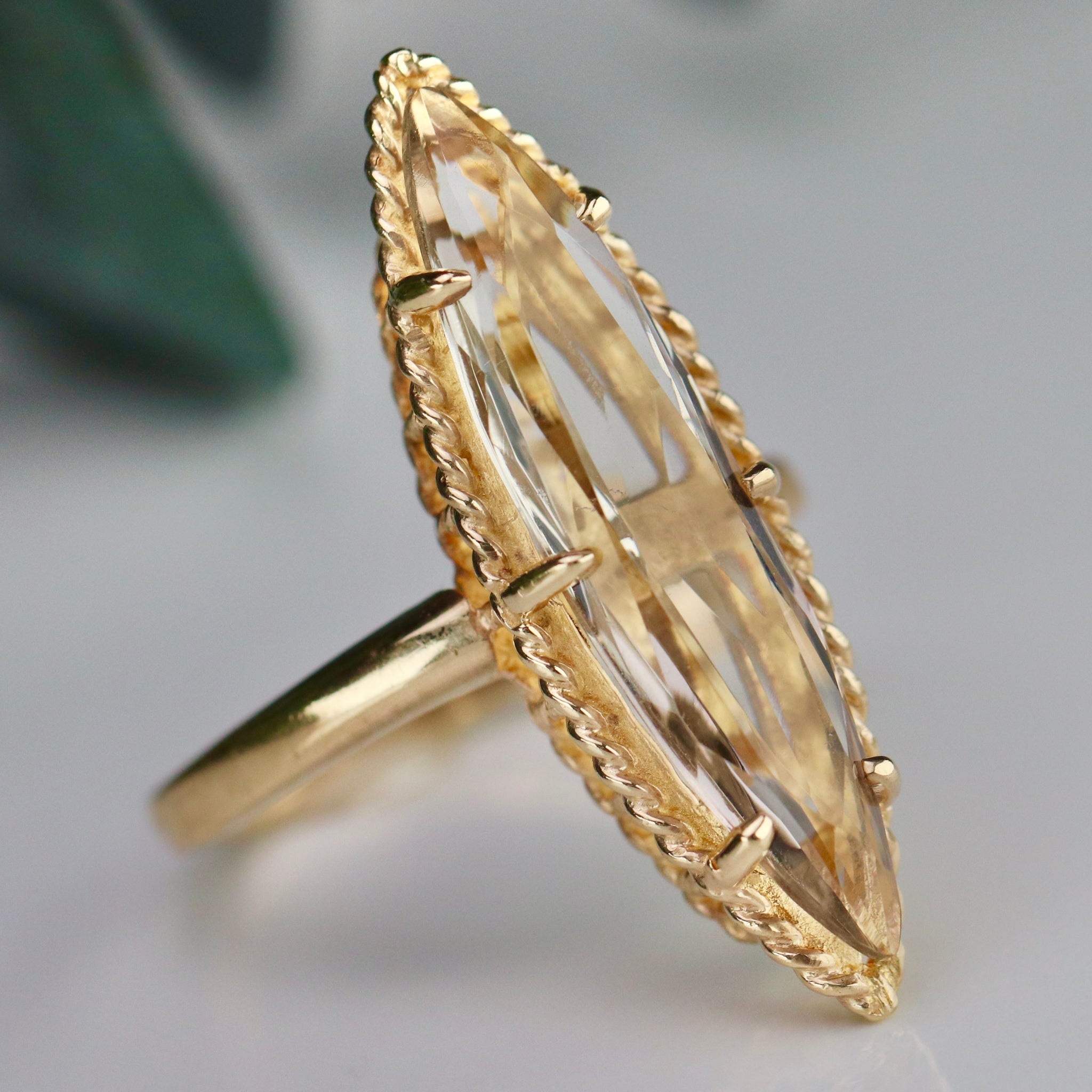 Gorgeous vintage smokey quartz navette ring in 10k yellow gold.  The lightest champagne color in a gorgeous setting full of rope detailing.  Absolutely gorgeous piece!  In very good condition.