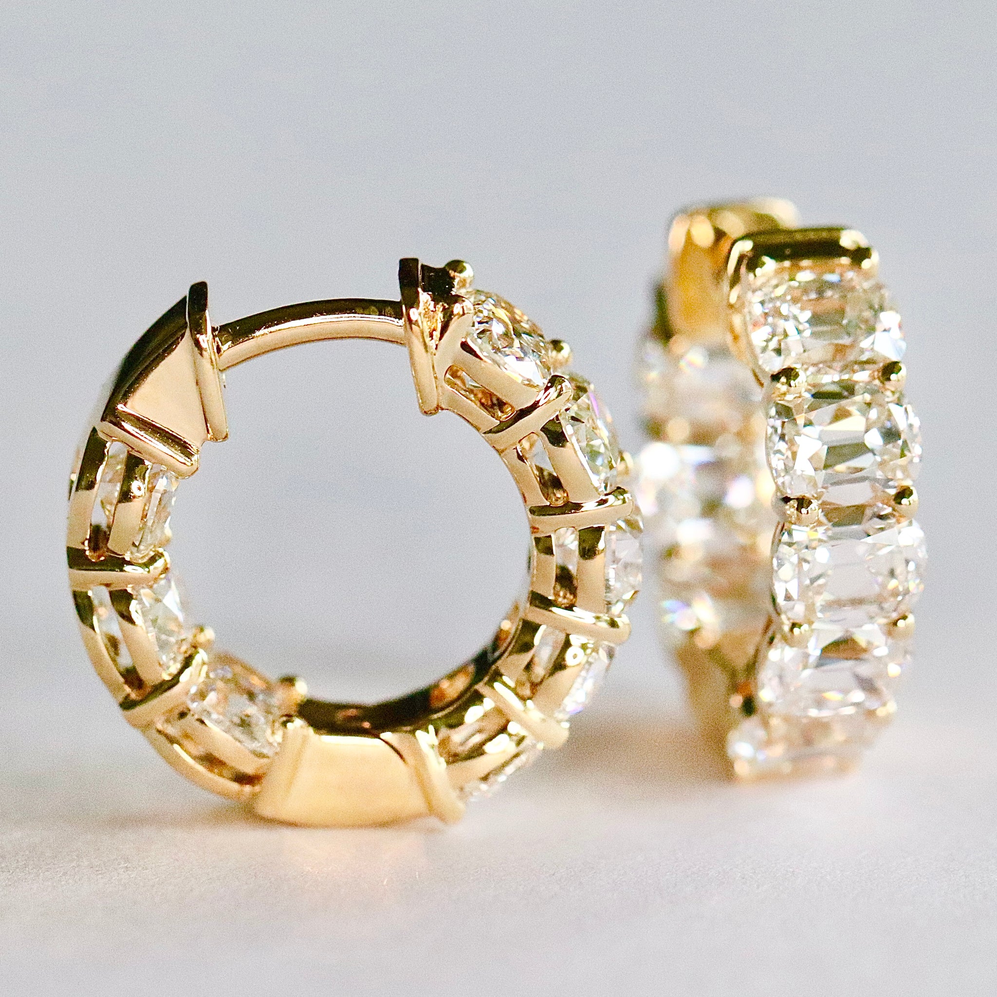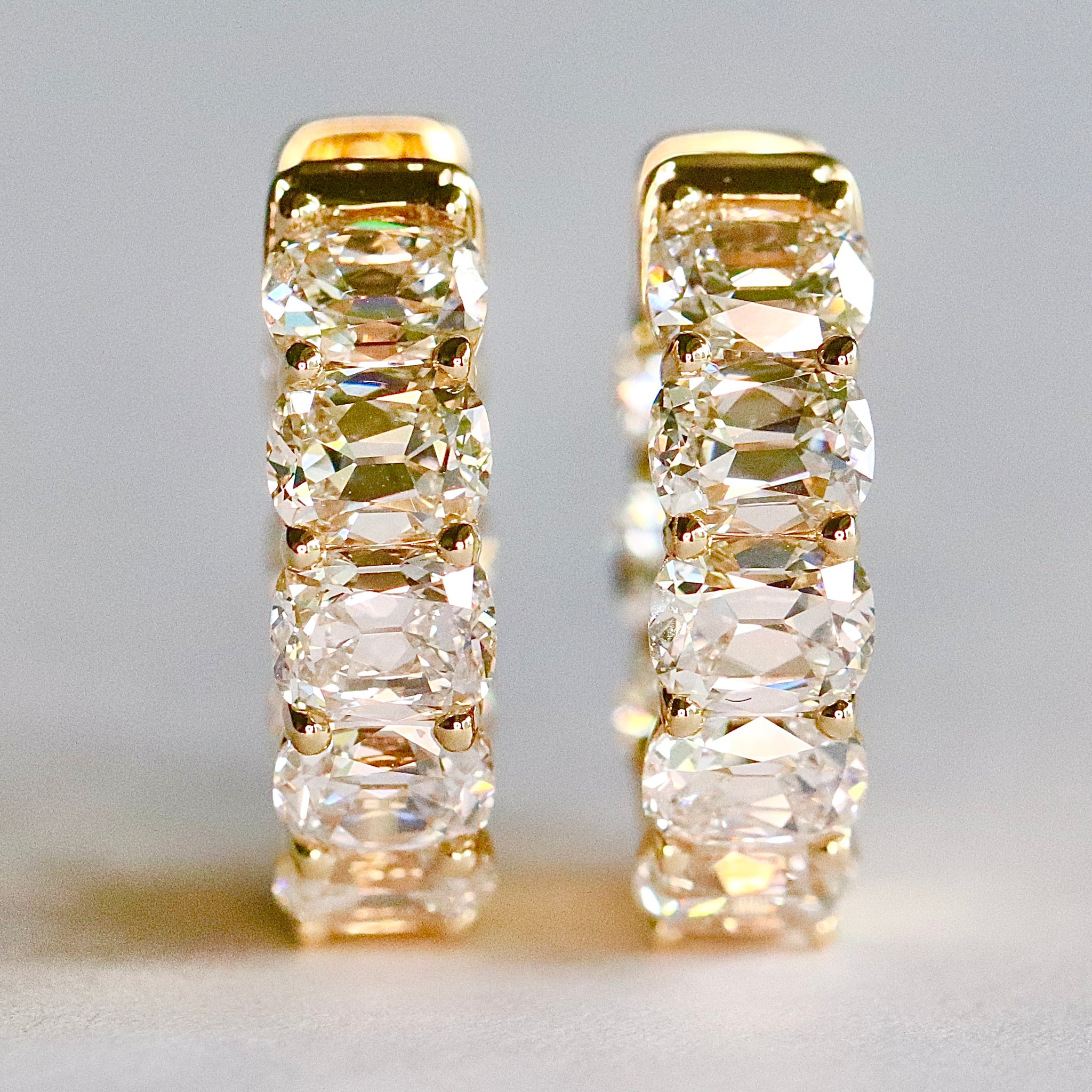 Lab grown diamond antique cushion cut huggie hoops in 14k yellow or white gold. Sitting nice and tight to the ear. Measuring approximately 15.3mm outside diameter and 4.17mm wide. Very striking. Diamond weight will be approximately 3.75ctw, E-F/VS. Blinding in the sunshine! New and unworn.