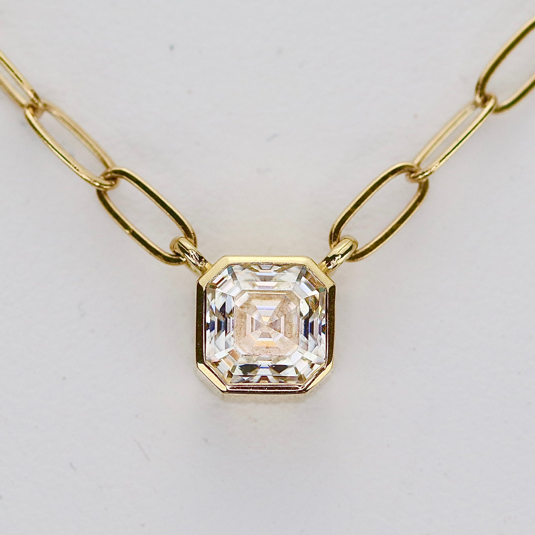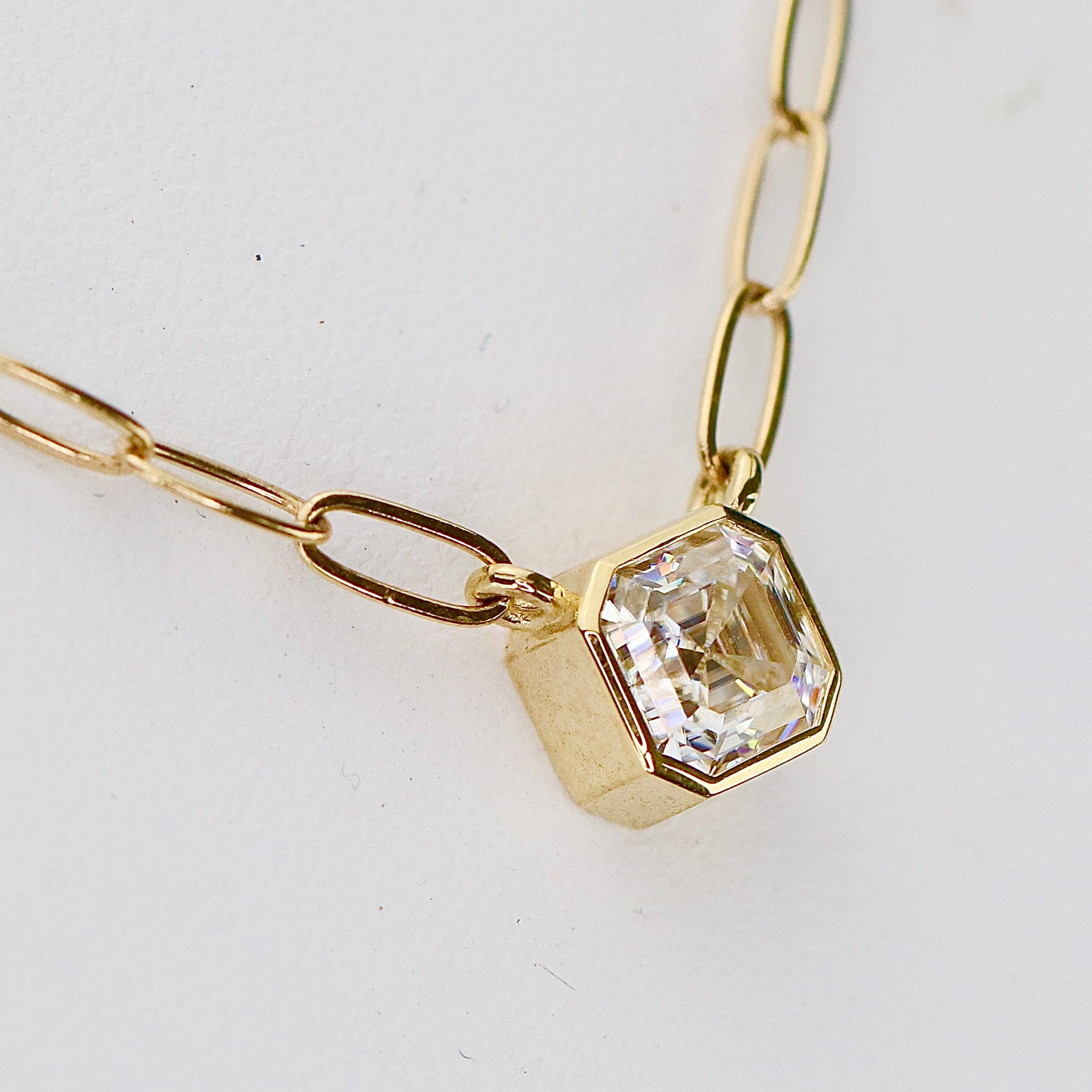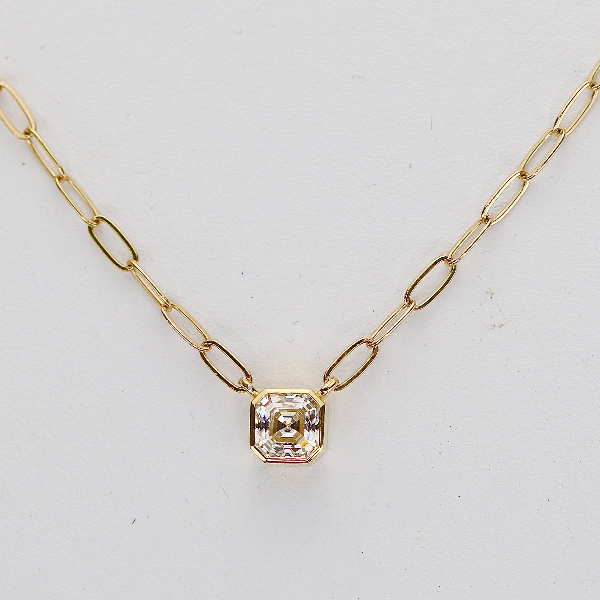 Beautiful necklace in 14k yellow gold. Set with a 5mm asscher cut moissanite into a simple bezel. 16” chain is paperclip style. New and unworn.