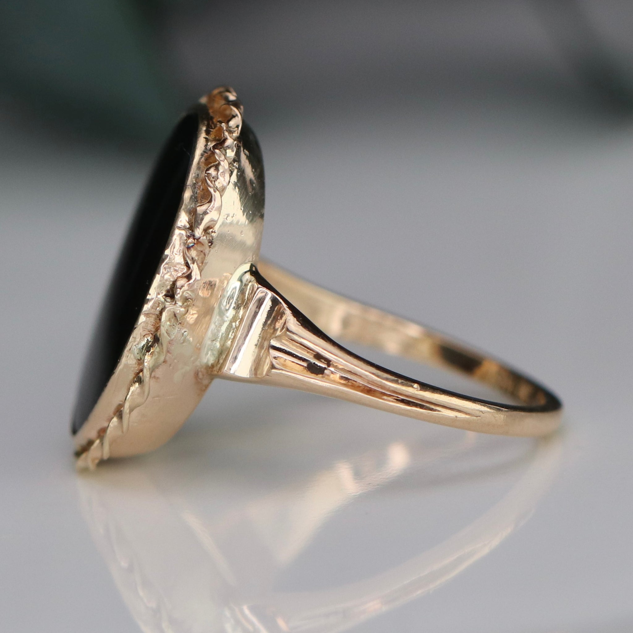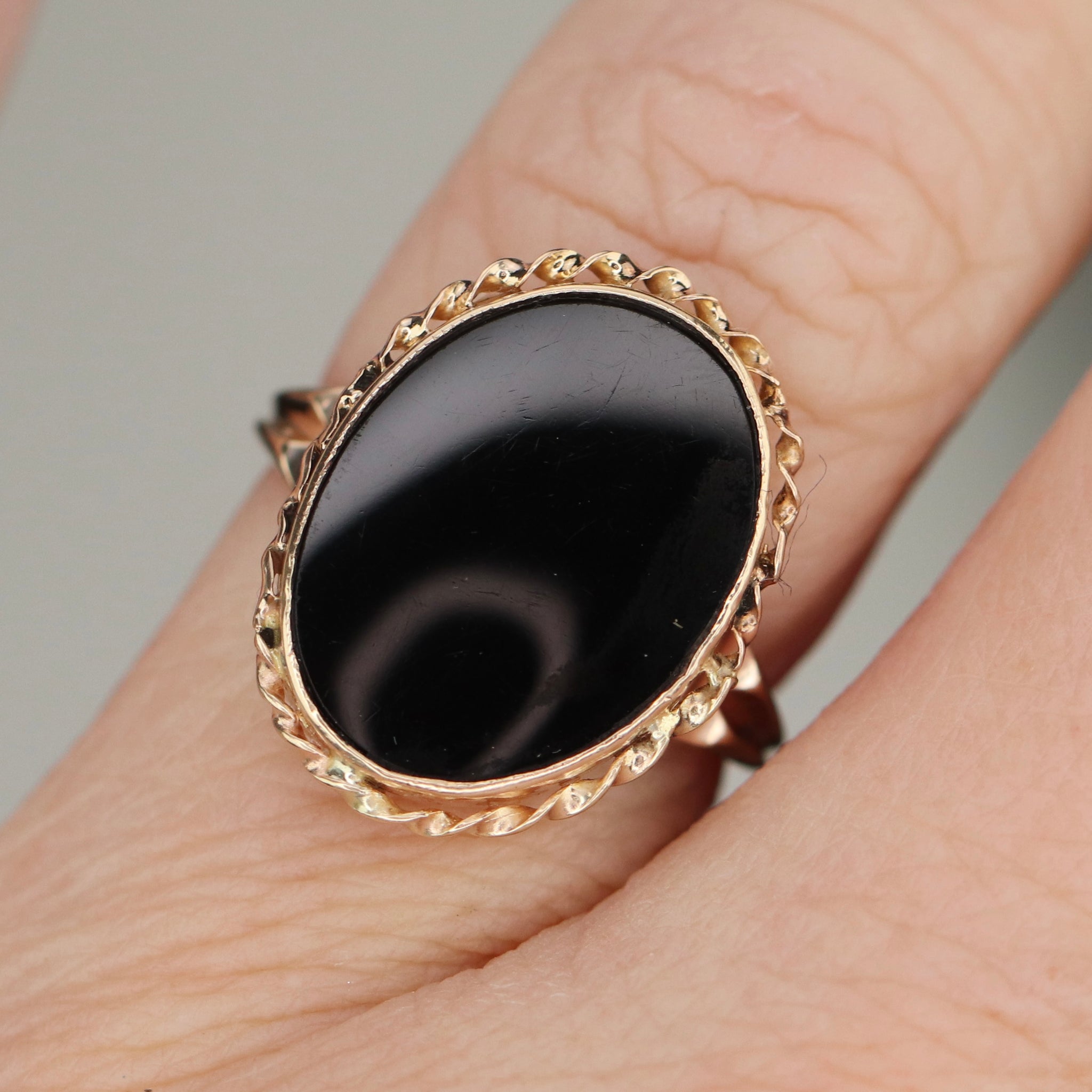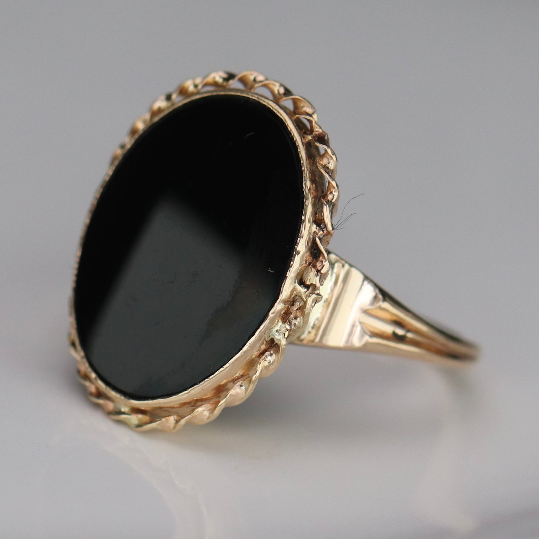 Classic oval onyx ring in 10k yellow gold.  Bezel set onyx makes for a low profile piece.  With twisted rope border and solid shoulders.  Vintage piece in good condition.