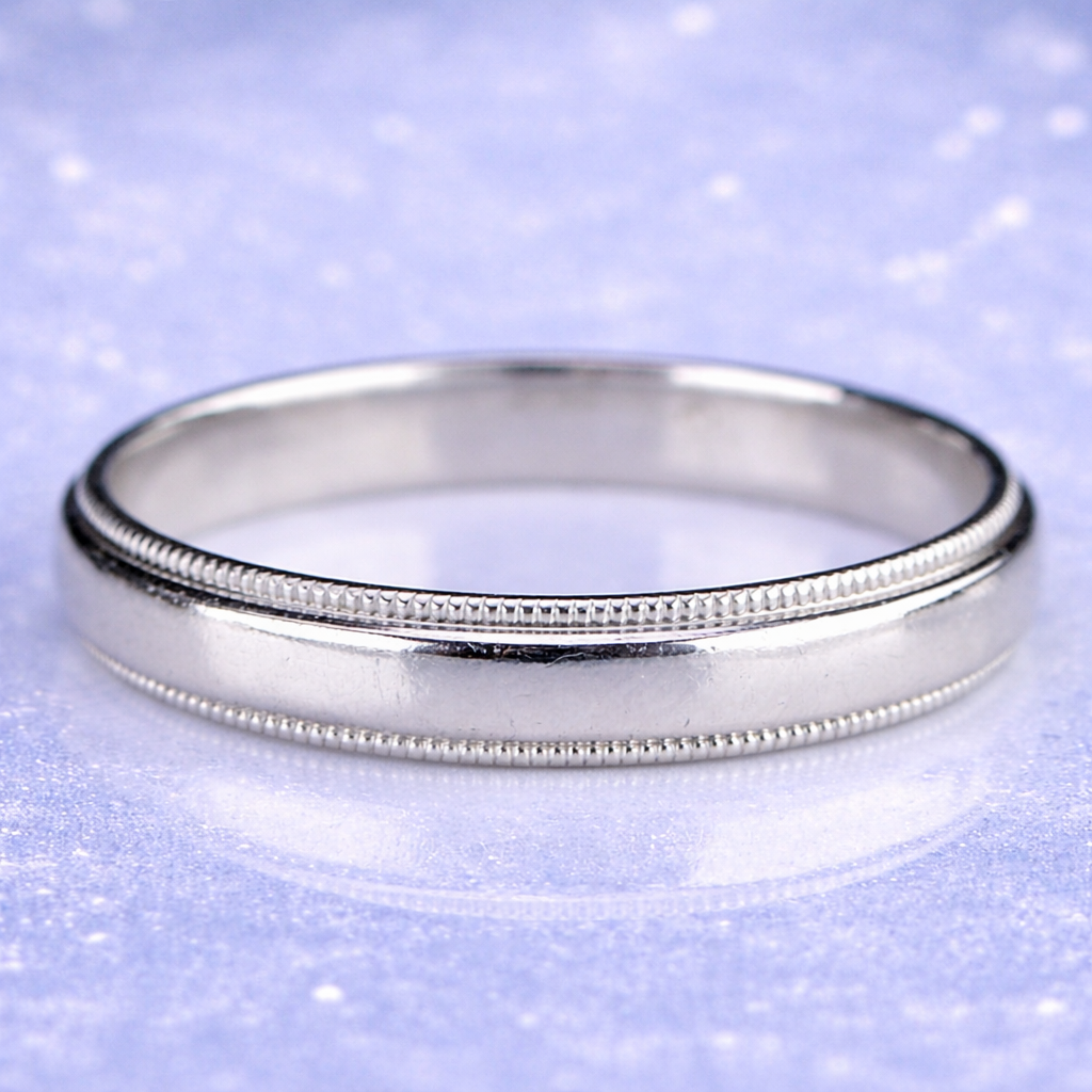 Estate solid platinum milgrain band. Classic style with milgrain to both sides. 4mm wide. In very good condition.