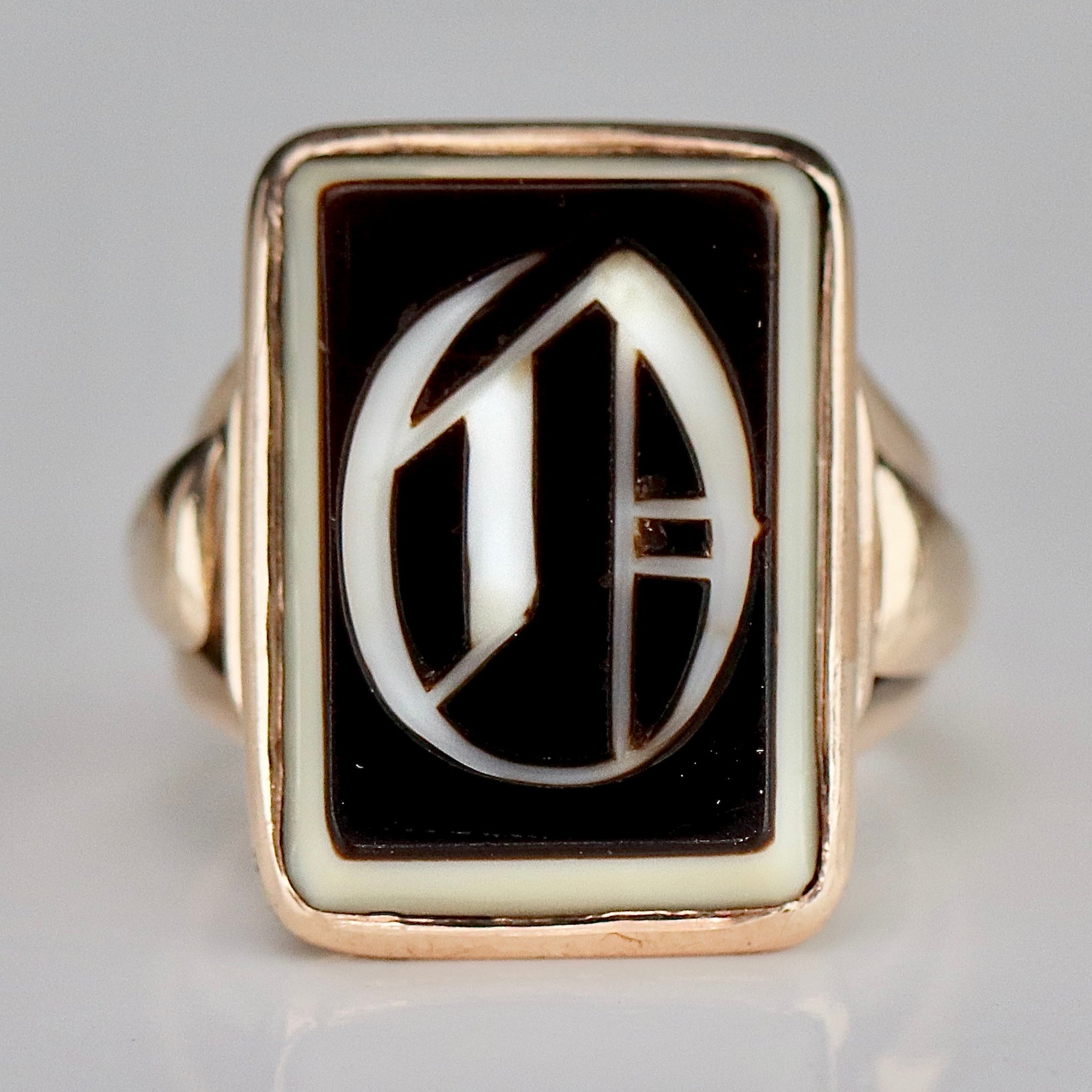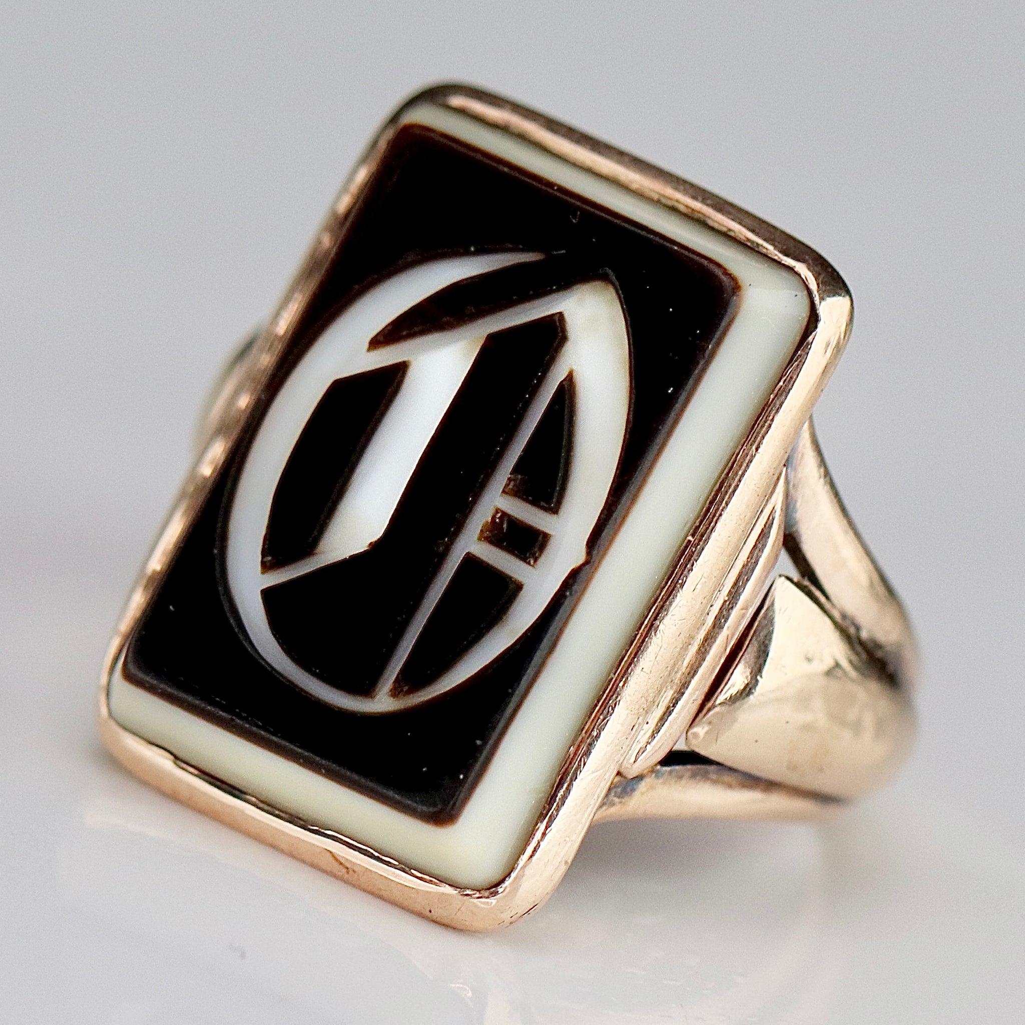 Vintage initial O banded agate ring in 10k rose gold. Tablet of banded agate engraved with a large gothic letter O to the center. Some minor wear and fleabites to the stone and some wear to the setting, but otherwise in good condition. Wide shoulders. Low profile and comfortable to wear.