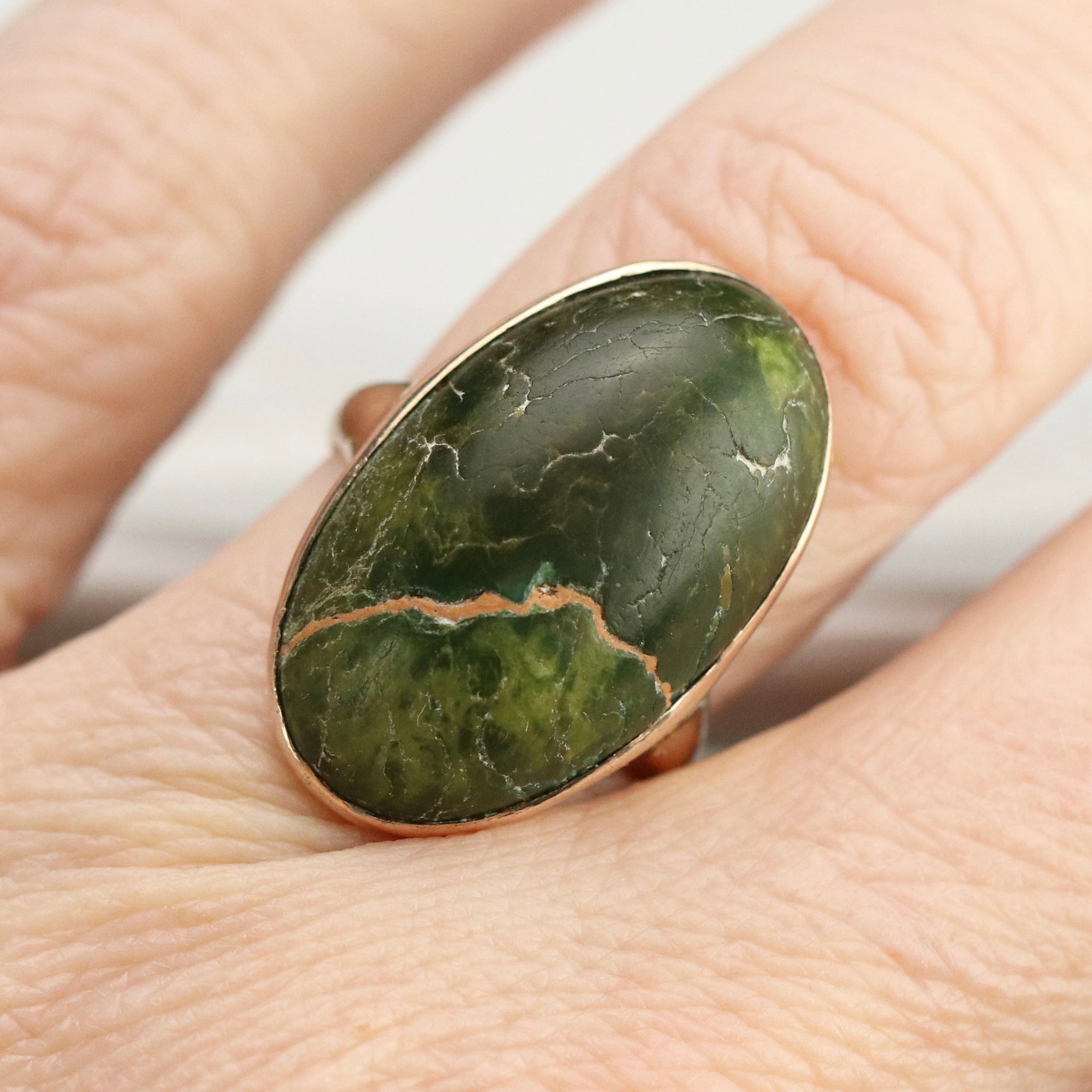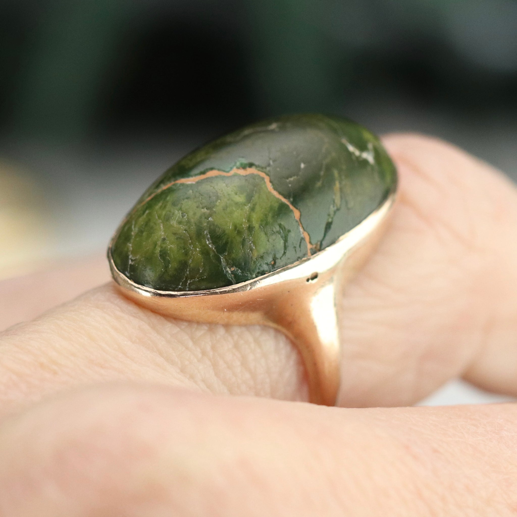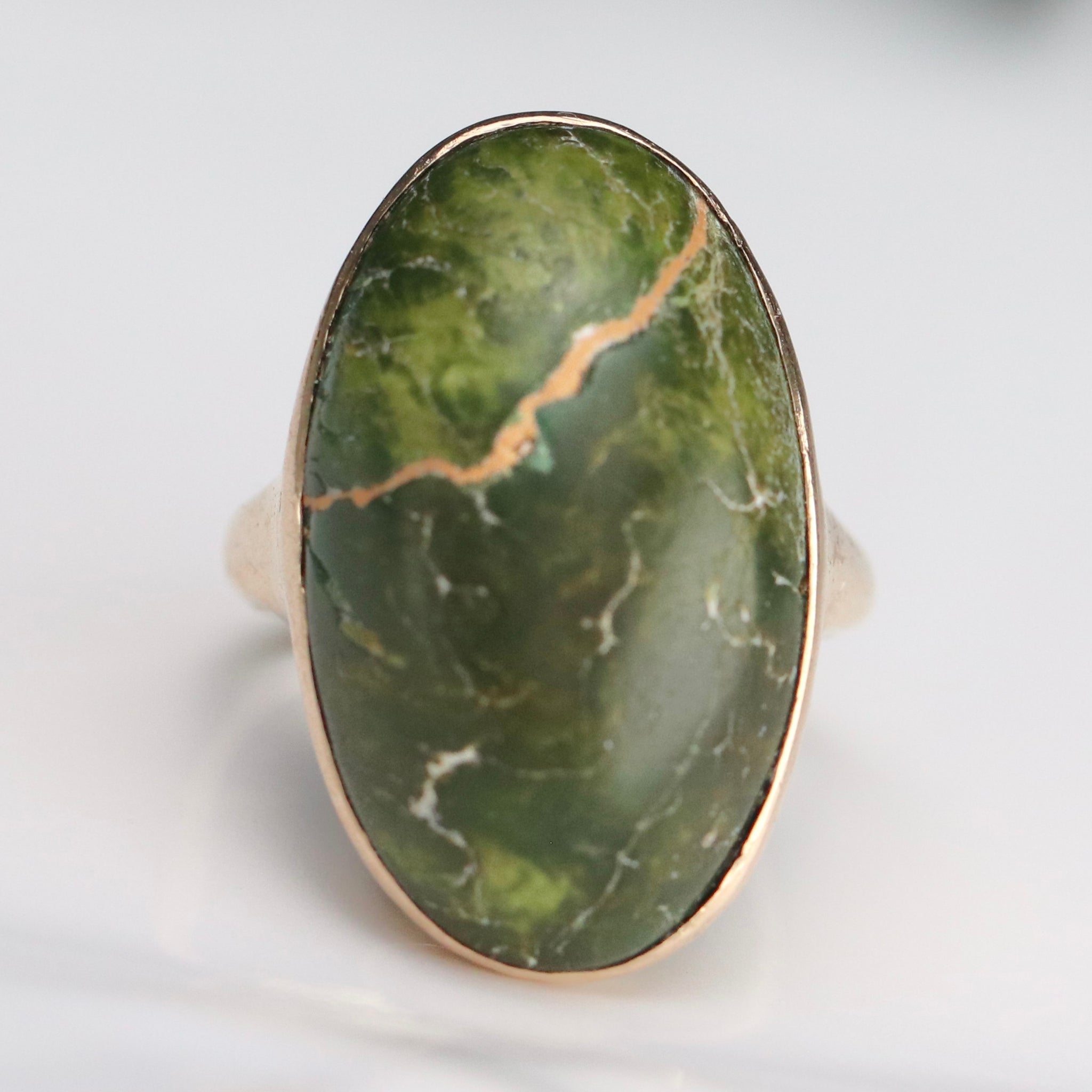 Truly a special piece. Green turquoise ring in 10k yellow gold. Large cabochon oval genuine turquoise with matrix. Classic smooth bezel setting. They don’t make them like this anymore! Some pitting to the gold and one small section of wear through the bezel - still lots of life to this piece! Unmarked, acid tested as 10k.