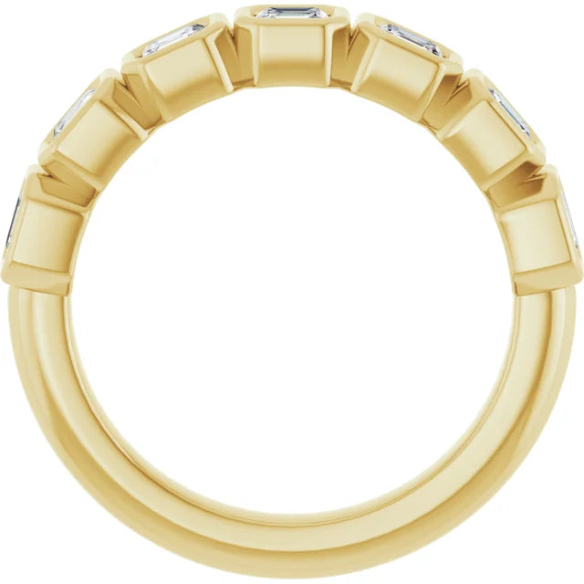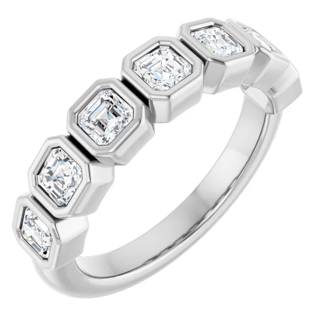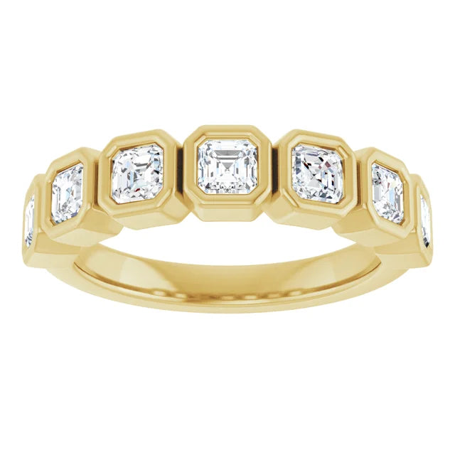 Lab grown diamond band in your choice of 14k gold. Set with 3mm asscher cut lab grown diamonds throughout in bezel settings. Diamond weight is approx 1ctw and stones are F-G, VS Width is approx 3.5mm. Made to order - lead time approx 4-6 weeks. THESE ITEMS ARE CUSTOM BUILT AND THE ORDER IS NONE REFUNDABLE.