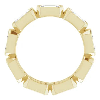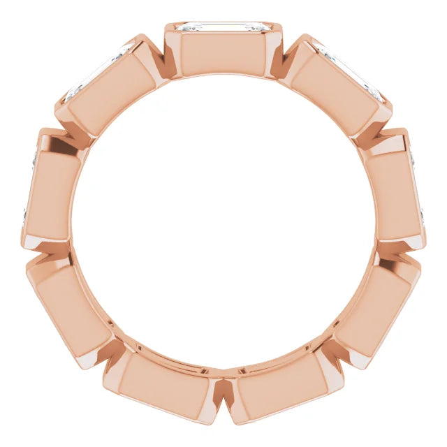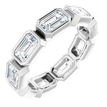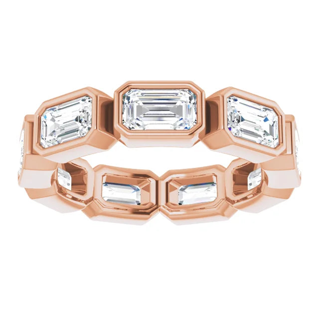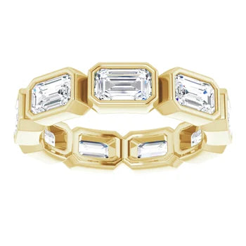 Lab grown diamond eternity band in your choice of 14k gold.  Set with emerald cut lab grown diamonds throughout in bezel settings.  Diamond weight is approx 3ctw based on a size 5.25 (will vary slightly based on finger size) and stones are F-G, VS  Width is approx 3.5mm. Made to order - lead time approx 4-6 weeks.  THESE ITEMS ARE CUSTOM BUILT AND THE ORDER IS NONE REFUNDABLE.
